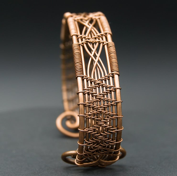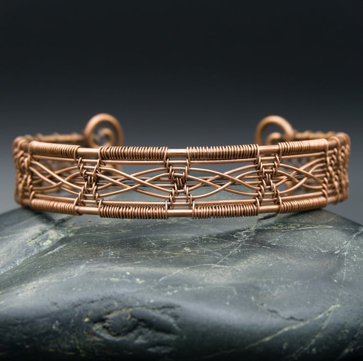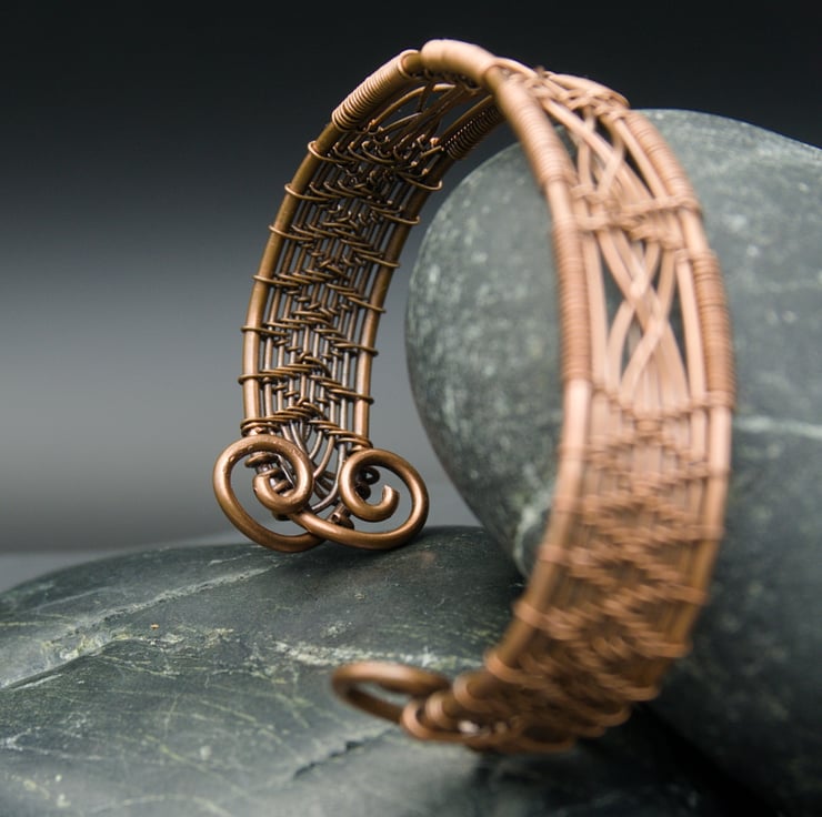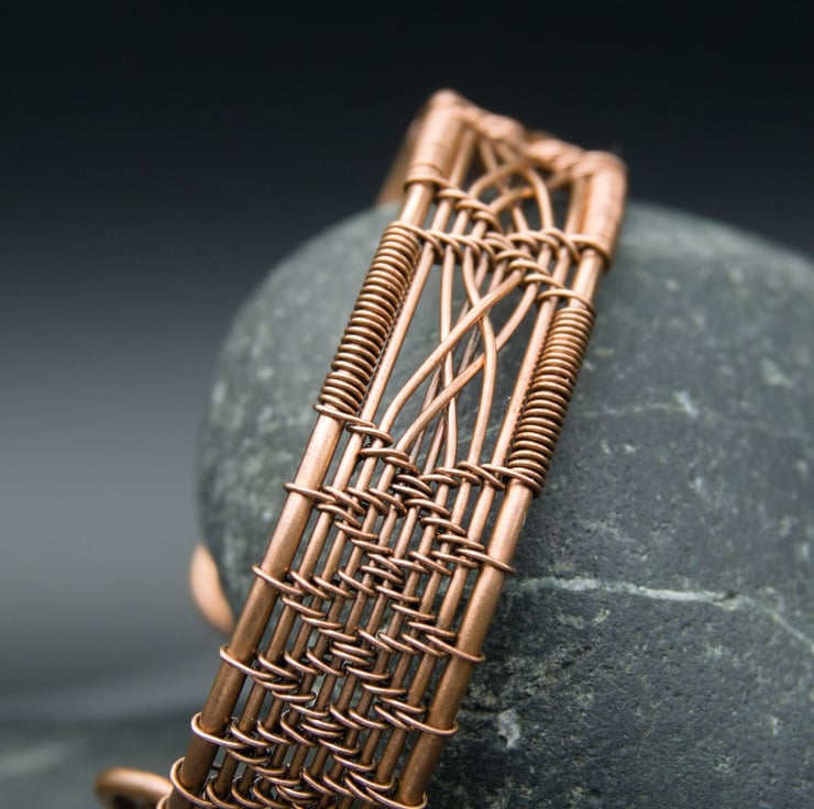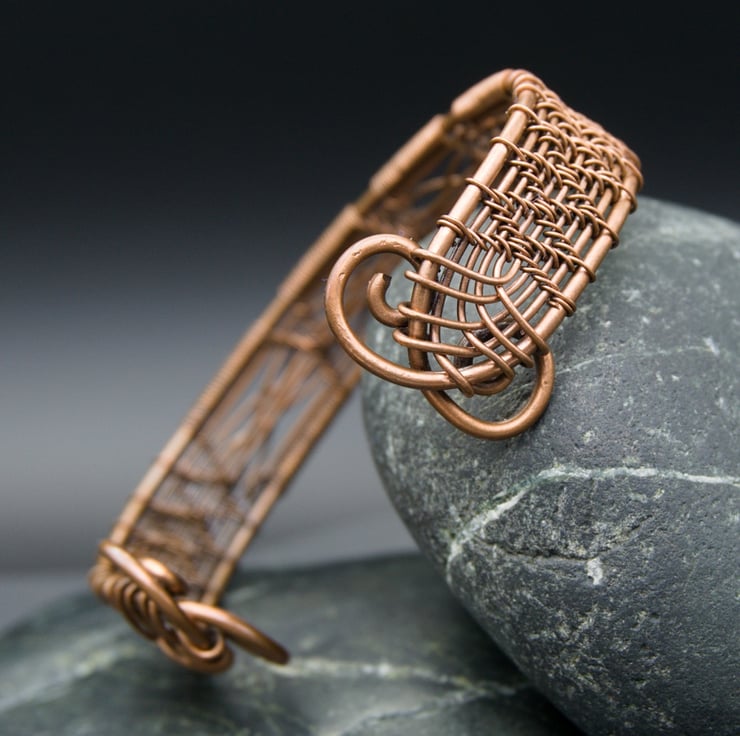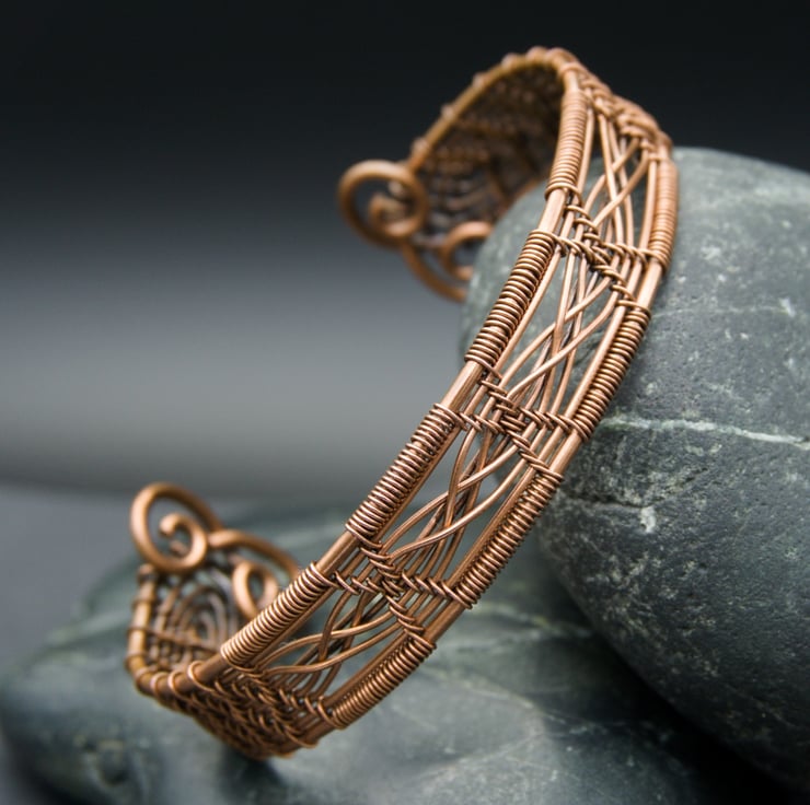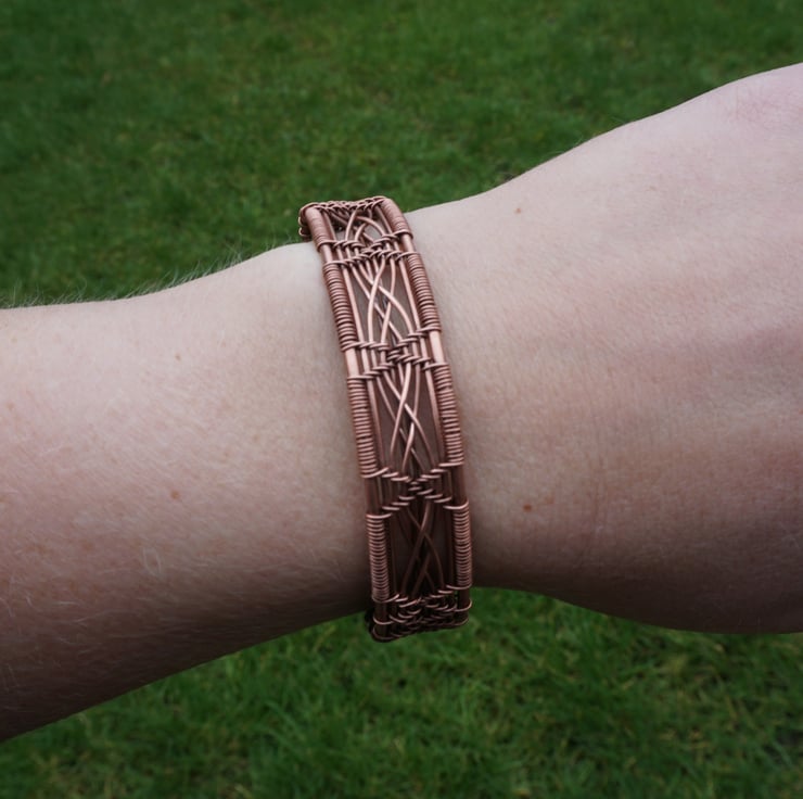 This intricate and elegant narrow cuff has been woven from three different gauges of bare copper wire, featuring a double cross detail in four panels across the front. The sides of the cuff have been woven with a diamond pattern, with the ends fishtailed & finished with attractive spirals, meaning it's not only pretty but comfortable to slip on & off. The completed bracelet was then antiqued to bring out the detail, & then lovingly polished to a beautiful shine.
