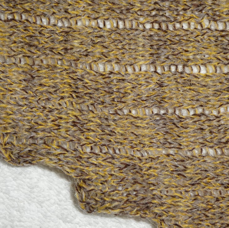 The yarn is acrylic and lovely and light and airy, but cosy and warm. The scarf has been washed and blocked. It has a gently rolling edge on the top, and a stepped shaped lower edge, with a drop stitch pattern across the body of the scarf.