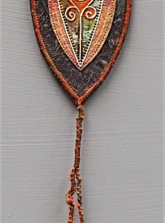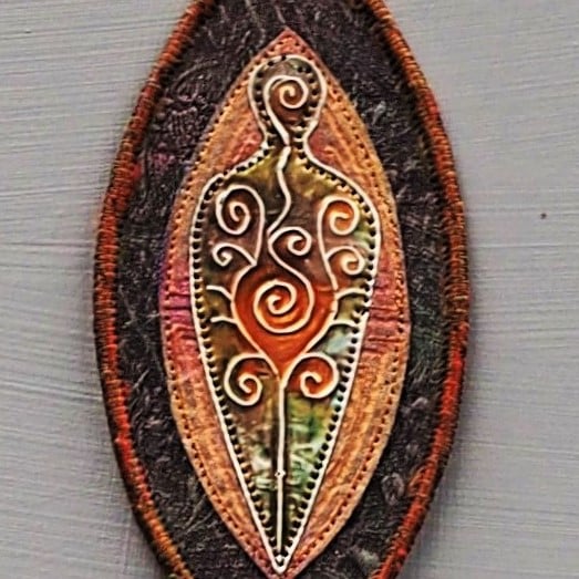 Hand embossed metal Goddess Wallhanging on a hand painted fabric background - 15cm (6") long plus yarn loop hanger and danglers with 2 hand rolled, painted paper beads (Overall length 48cm) Edged with yarn and complimentary coloured thread machine stitching. I make these in a number of sizes, colours and designs, this is a mini one