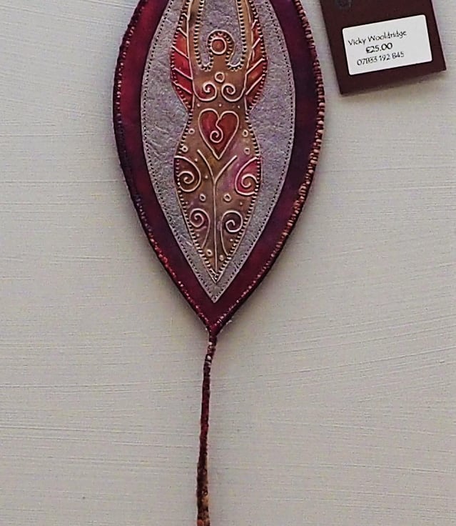 Hand embossed metal Goddess Wallhanging on a hand painted fabric background - 21cm (8.5") long plus yarn loop hanger and danglers with 2 hand rolled, painted paper beads (Overall length 60cm) Edged with yarn and complimentary coloured thread machine stitching. I make these in a number of sizes, colours and designs, this one is a small/medium size