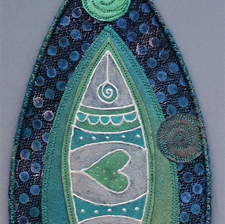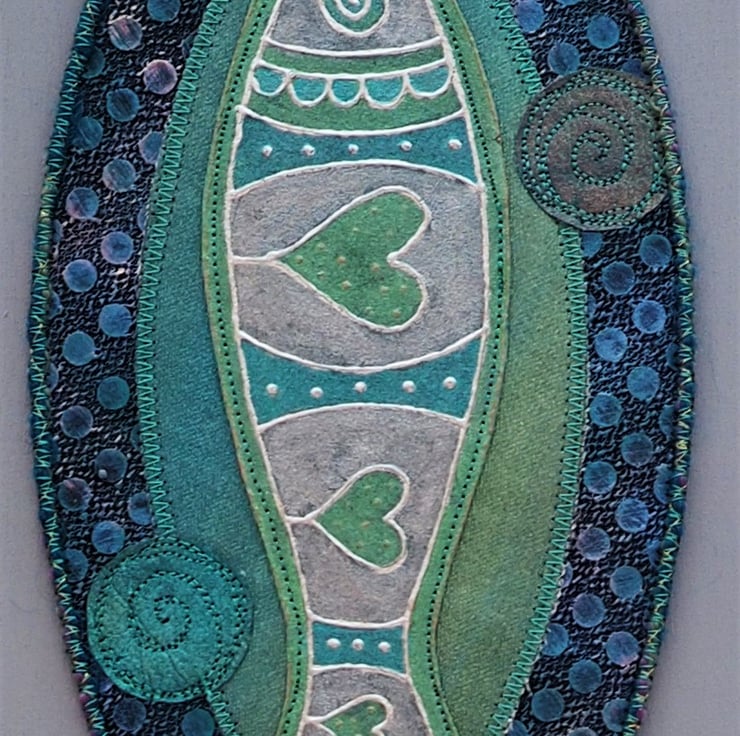 Fish Shield Wallhanging - 30cm (12") long plus yarn hanging loop, edging and danglers with handmade, painted paper beads - (Overall length approx 78cm). I designed and printed the fish onto fabric with lino then painted it with fabric paints,outlined it in silver then stitched in place. The background has painted fabrics (stiffened on the back to hold it's shape). The circular bubbles are various painted fabrics with free machine embroidery spirals. Everything is secured in place with machine stitching. The mixed yarns are added to tone or compliment the finished piece