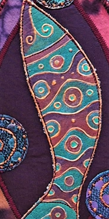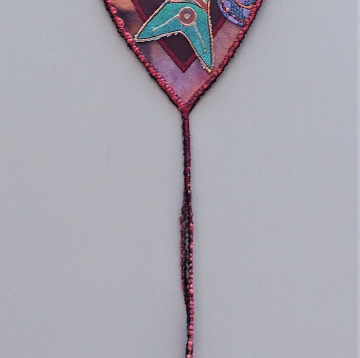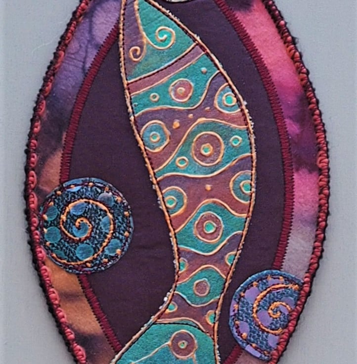 Fish Shield Wallhanging - 22.5cm (9") long plus yarn hanging loop, edging and danglers with handmade, painted paper beads - (Overall length approx 65cm). I designed and printed the fish onto fabric with lino then painted it with fabric paints,outlined it in copper then stitched in place. The background has dyed silk/lining fabrics (stiffened on the back to hold it's shape). The circular bubbles are painted sequin fabrics with free machine embroidery spirals. Everything is secured in place with machine stitching. The mixed yarns are added to tone or compliment the finished piece.