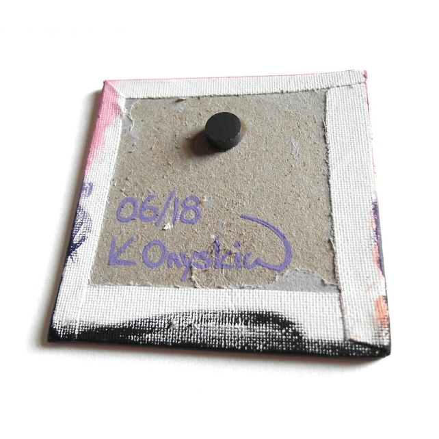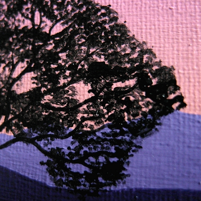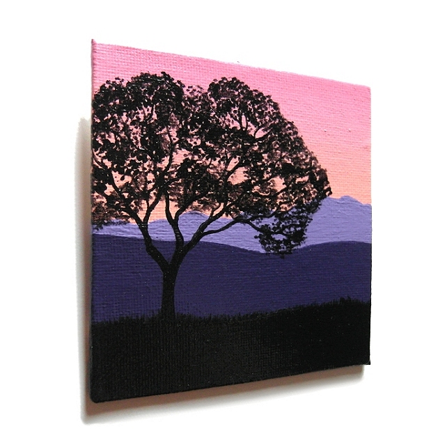 This original dawn landscape is hand painted in acrylics on a 10cm x 10cm (4" x 4") canvas board, with a layer of clear varnish to make it more durable. An 18mm magnet is attached to the back so it can stick to a fridge or other magnetic surface.