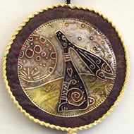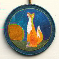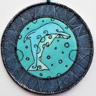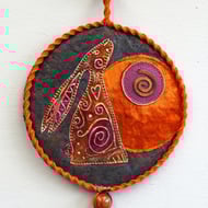 Moon Gazer Hare Mandala - Original design lino cut - printed then painted and outlined on a hand painted fabric background. Free machine embroidered spiral moon on painted felt - 15cm (6 inch) diameter plus yarn loop and danglers with hand rolled, painted paper beads. Edged with yarn and coloured rayon thread machine stitching (Overall length 58cm).