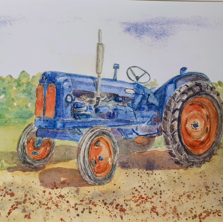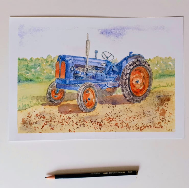 A professionally produced digital print from from my original watercolour of a Fordson Major classic tractor in blue, in an imagined rural scene.