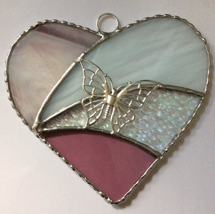 A four segment heart cut from lilac , white , clear irridised and wispy lilac glass made into a 140 mm heart with an added silvery filigree butterfly.