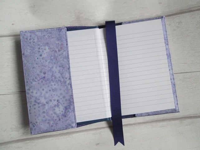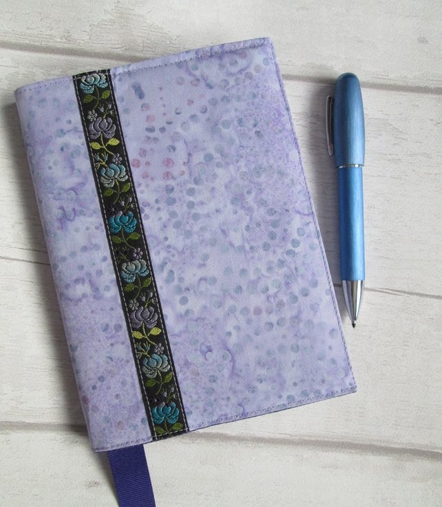 This lovely subtle lilac and grey batik fabric works really well with the length of woven floral ribbon I've chosen to embellish it. Lined with a darker purple cotton print and incorporating a purple ribbon place marker, this handy notebook would make a great gift or stocking filler as it comes complete with a lined notebook.