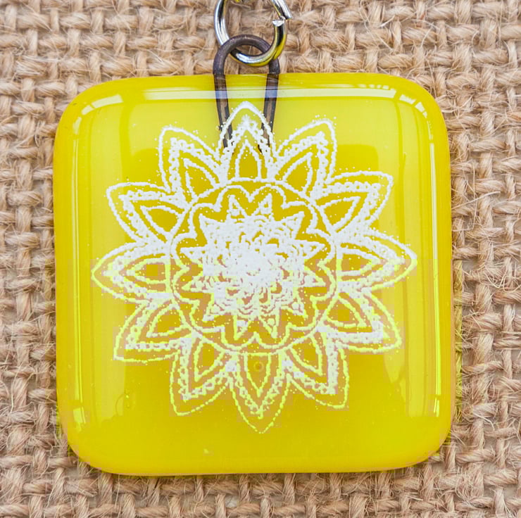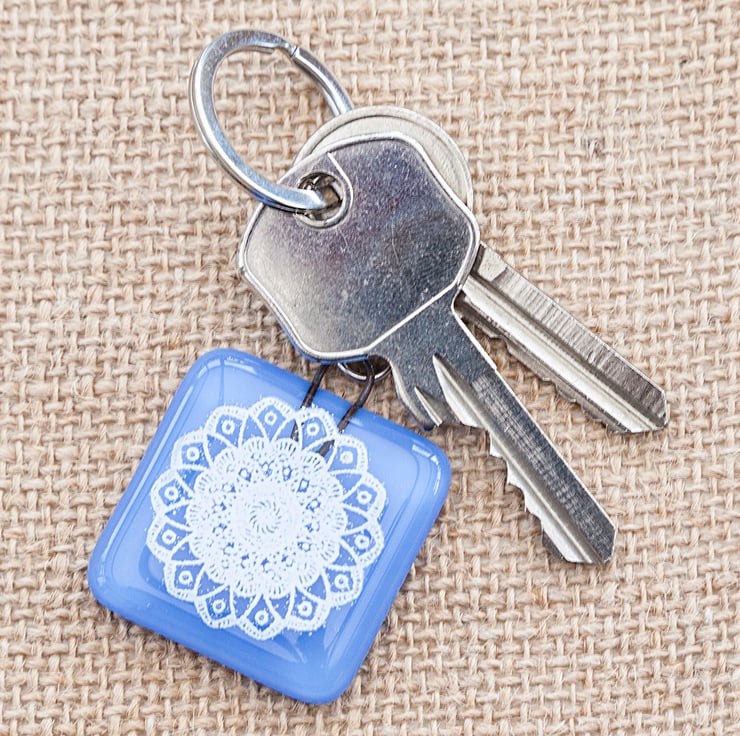Pretty little mandala keyrings/keychains. Each one has been handmade from fused glass and then the pattern has been screen printed onto the surface with white enamel. The enamel is then fired into the surface so it won't scratch off at all.