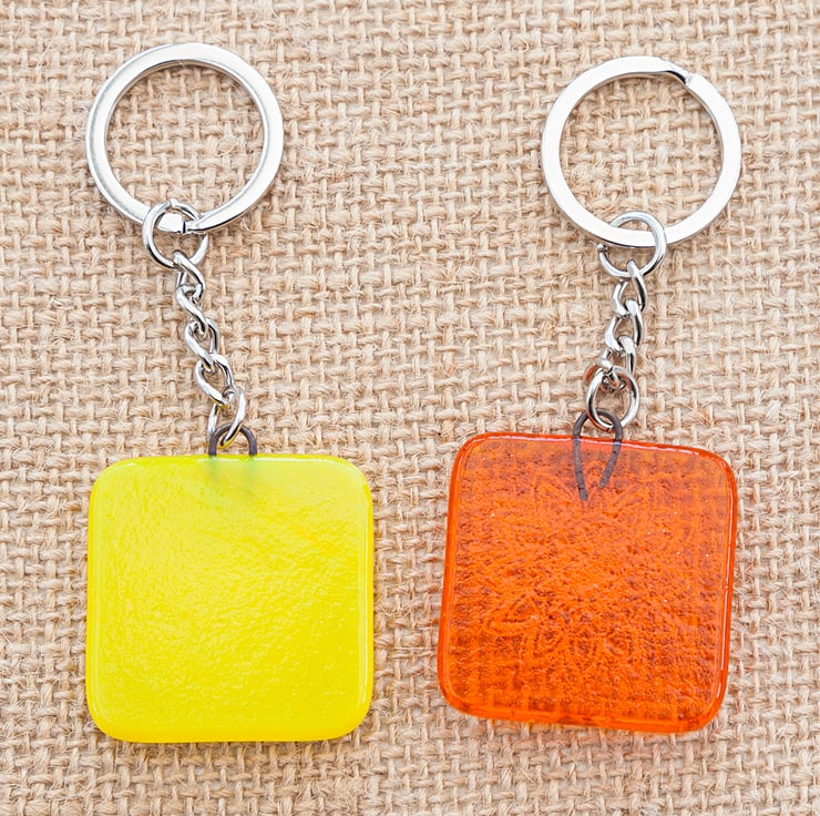 The glass measures approximately 3.5cm by 3.5cm and is attached to a high quality silver-coloured metal split-ring, the split-ring measures approximately 2.5cm in diameter with a chain length of around 3cm.