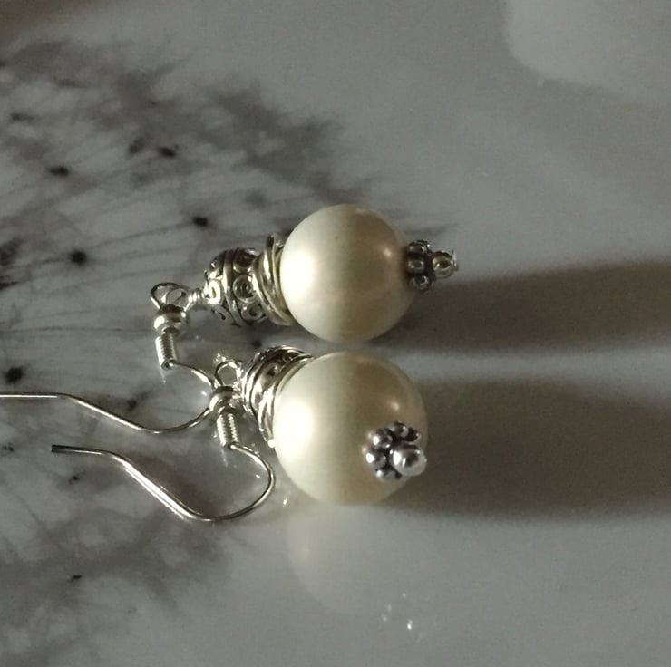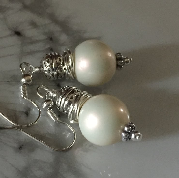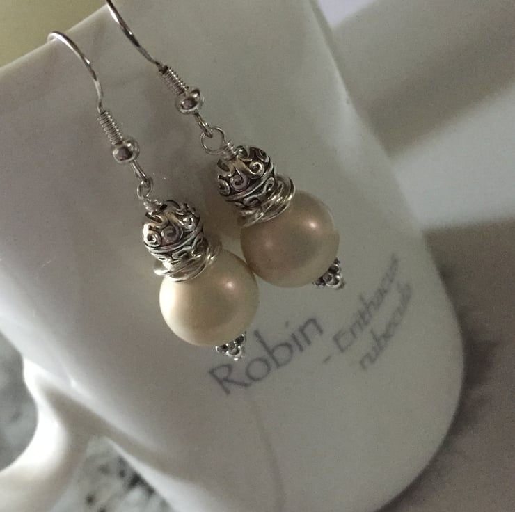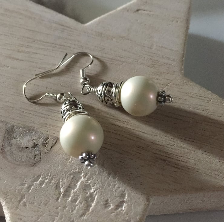 Lovely 12mm pearls in a cream colour with a beautiful iridescent finish, tiibetan beads and silver plated ear wires to finish. Please note the ear wires can be replaced with sterling silver if you prefer (Please see optional extra's listed below).