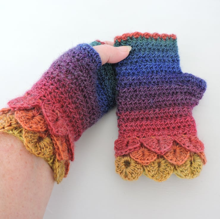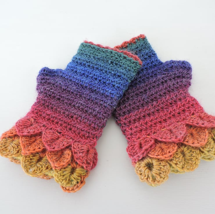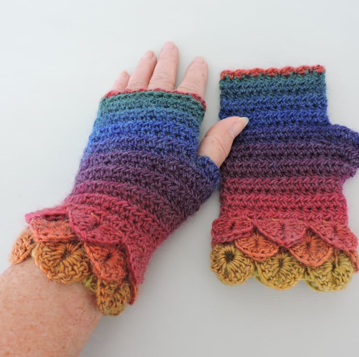 These rainbow coloured adults dragon scale cuff fingerless mitts, gloves, come wrist warmers have been crocheted in a soft acrylic and wool double knit multi tonal yarn. Graduated colours of red, yellow, pink, green, orange, purple and blue,.
