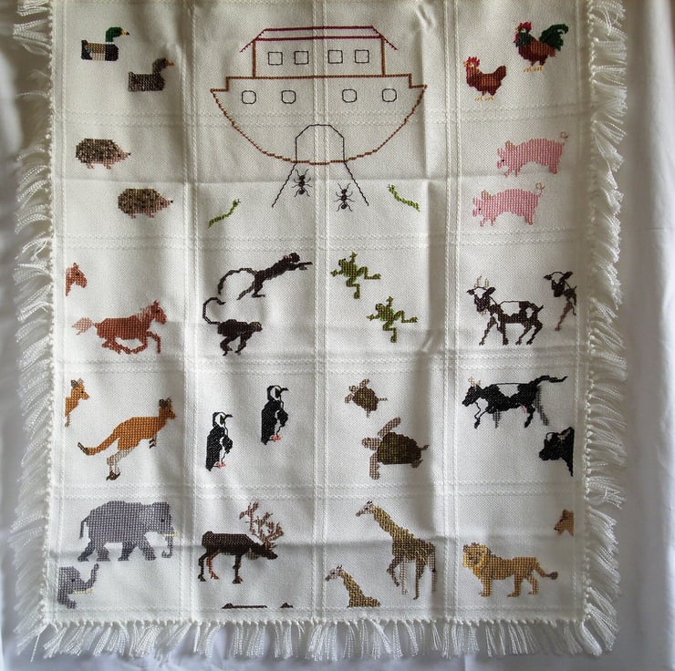 I was singing 'The Animals went in Two by Two' to my grandson, when it occurred to me that I could embroider that on a shawl. I didn't stick to the song script, but drew animals that appealed to me from photographs.