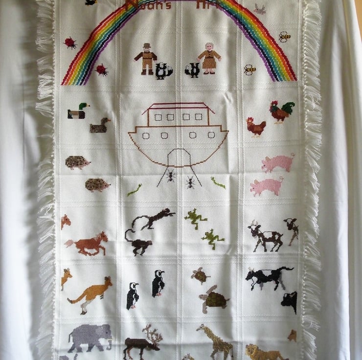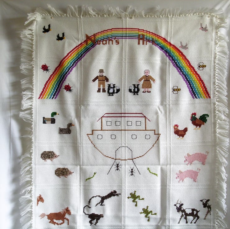 'Noah's Ark' is a soft acrylic Afghan shawl or wall-hanging, with fringed and knotted edges. Of all the shawls I have designed and made so far, I think this is my favourite. It certainly took me the longest to embroider! The rainbow is embroidered in the correct colour sequence and was extremely complicated to make. The work measures 24" (60cm.) by 38" (96cm.) approximately within the fringe, and is colour-fast and hand-washable in cool water.