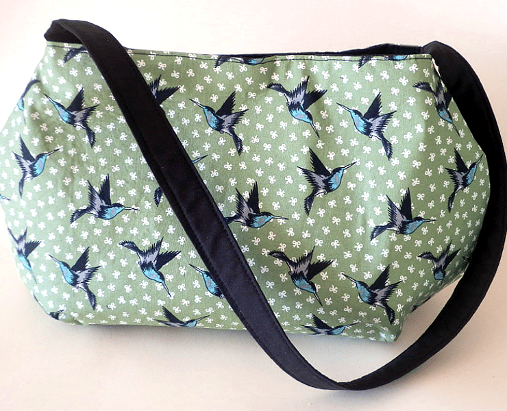 Here we have a beautiful, sage green shoulder bag, covered in pretty humingbirds and bows.