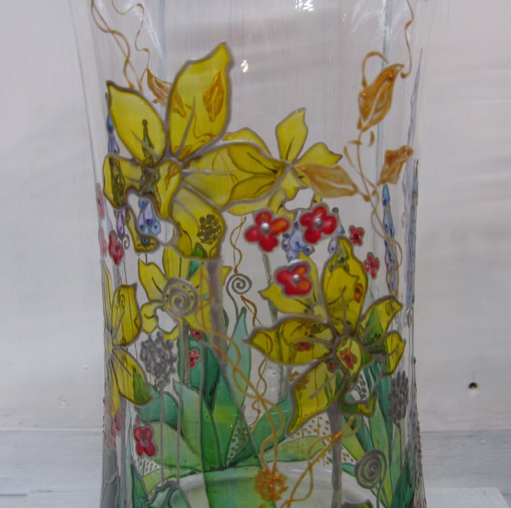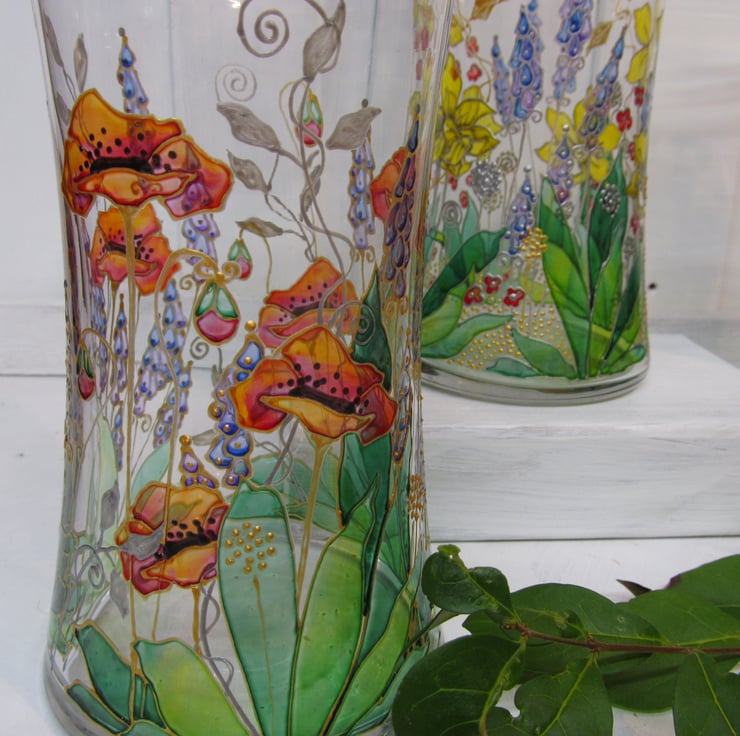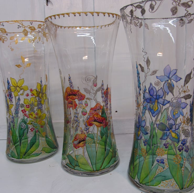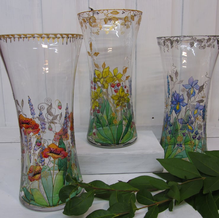 Glass is a beautiful material to work with, it responds so well to being painted and these vases make the ideal Christmas gift. We have painted each design as if the flowers are growing up around the base of the vase.