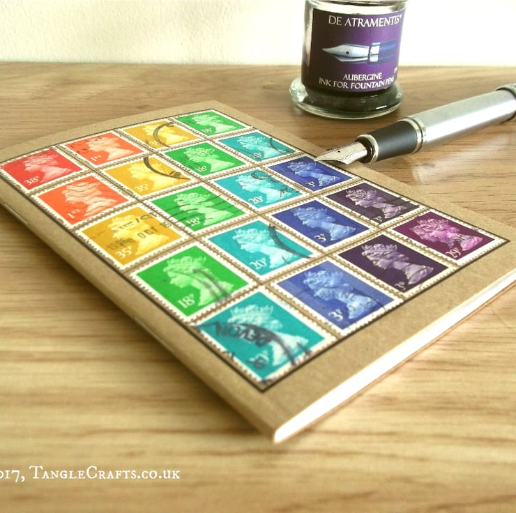 Each upcycled notebook is made to order, so exact stamps used may vary slightly, but will follow colour pattern as shown. Every notebook is utterly unique, due to placement of postmarks etc. The reverse of front cover will be date-stamped with the date of completion.