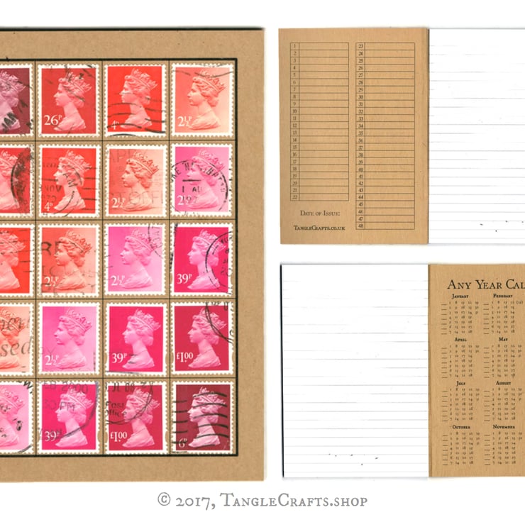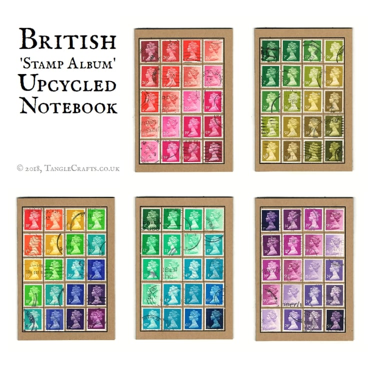 Each upcycled notebook is made to order, so exact stamps used may vary slightly, but will follow colour pattern as shown. Every notebook is utterly unique, due to placement of postmarks etc. The reverse of front cover will be date-stamped with the date of completion.