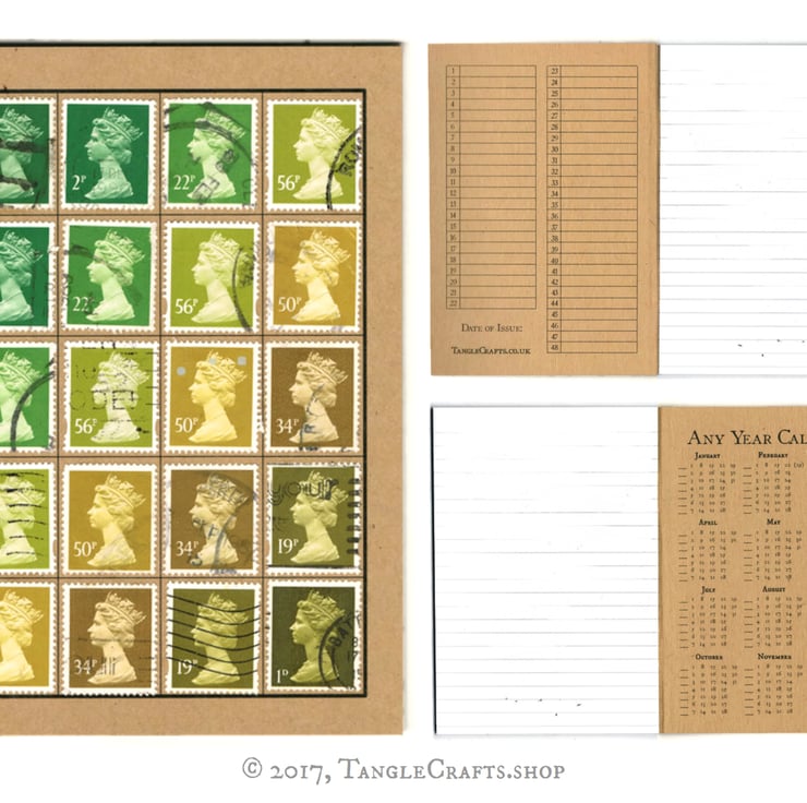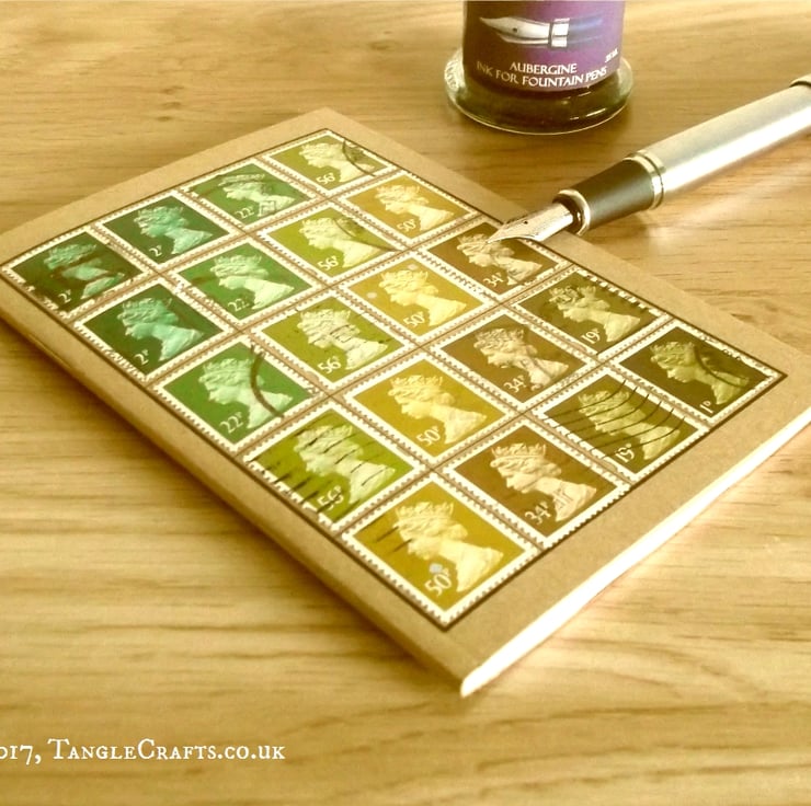 Each upcycled notebook is made to order, so exact stamps used may vary slightly, but will follow colour pattern as shown. Every notebook is utterly unique, due to placement of postmarks etc. The reverse of front cover will be date-stamped with the date of completion.