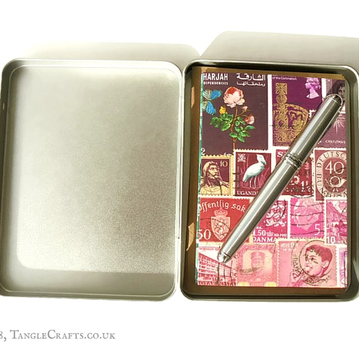 The lid of the tin is decorated with a matt-finish decal which has been professionally printed then carefully applied by hand. The design is reproduced from one of my original postage stamp collages (Heather Haze), so you will not find it anywhere else! The decal is made of matt, waterproof vinyl, backed with a strong permanent adhesive. You can also choose from 3 more tonal designs - or collect them all!