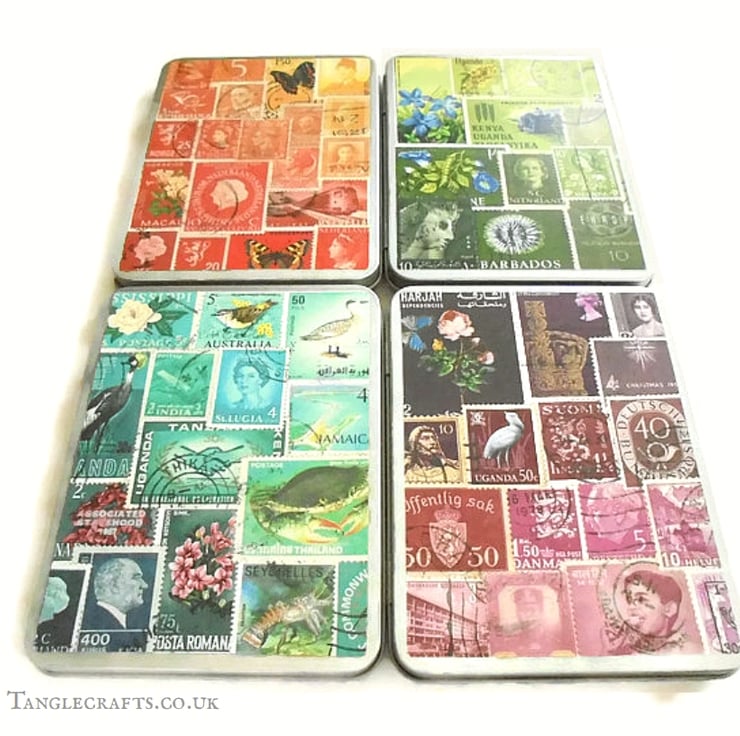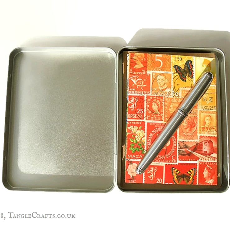The lid of the tin is decorated with a matt-finish decal which has been professionally printed then carefully applied by hand. The design is reproduced from one of my original postage stamp collages (Fire Glow), so you will not find it anywhere else! The decal is made of matt, waterproof vinyl, backed with a strong permanent adhesive. You can also choose from 3 more tonal designs - or collect them all!