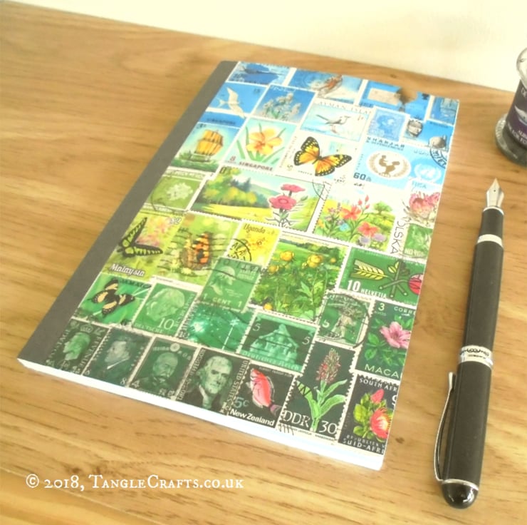 The original postage stamp collage that inspired this journal quickly found a new home, but I am happy to be able to recycle the design so that others may also appreciate the wonderful colours, as well as the history and character of the stamps that combined in its composition.