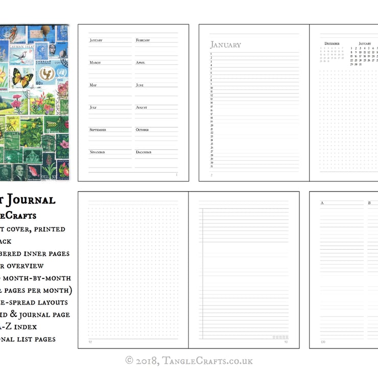 feature an an undated month by month planner for any year use (great for recording birthdays & anniversaries as well as monthly appointments), plus dot & ruled journal pages (suitable for weekly bullet journal layouts), an A-Z address section, and extra to-do list pages.
