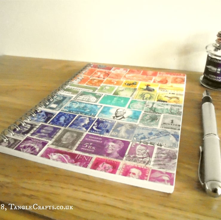 The original postage stamp collage that inspired this journal quickly found a new home, but I am happy to be able to recycle the design so that others may also appreciate the wonderful colours, as well as the history and character of the stamps that combined in its composition.