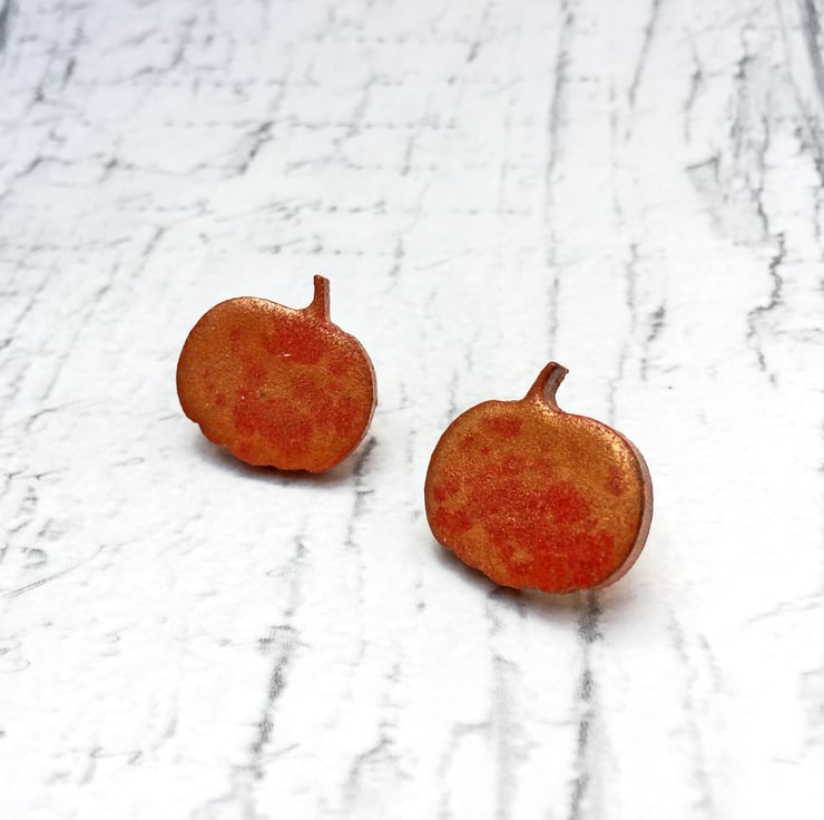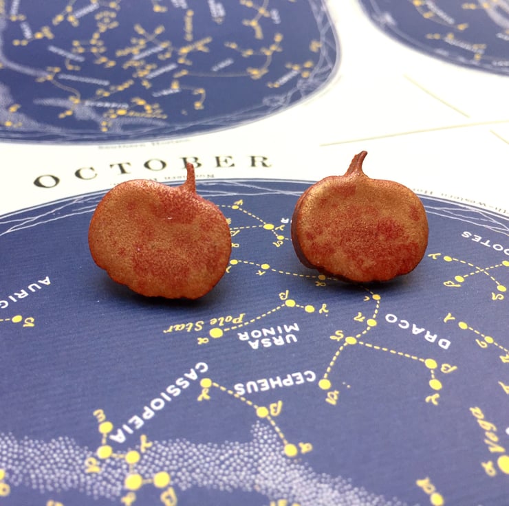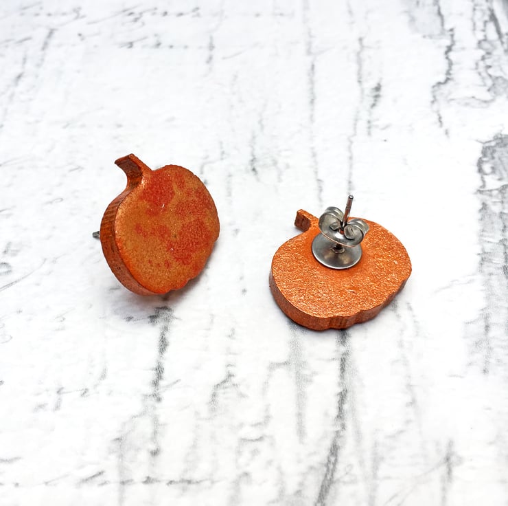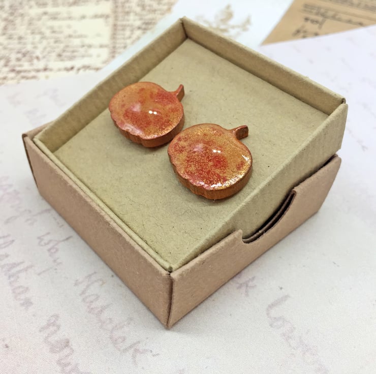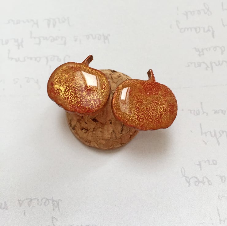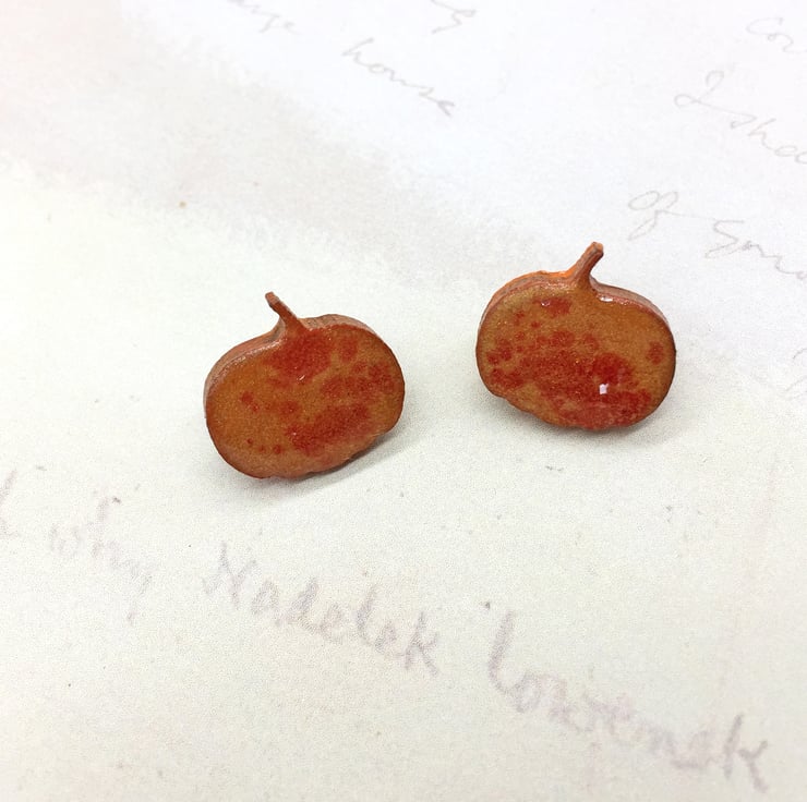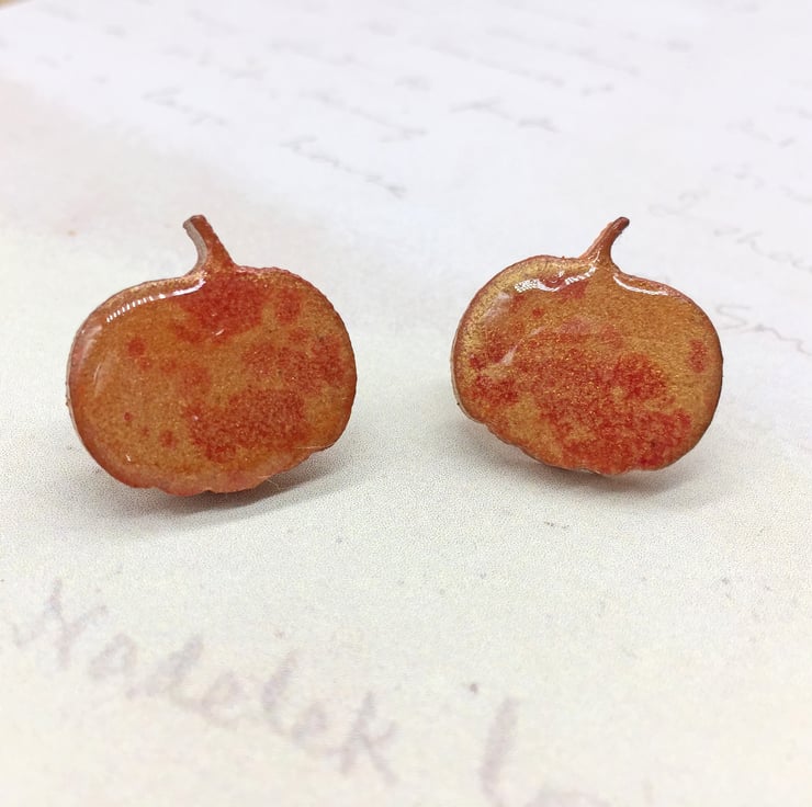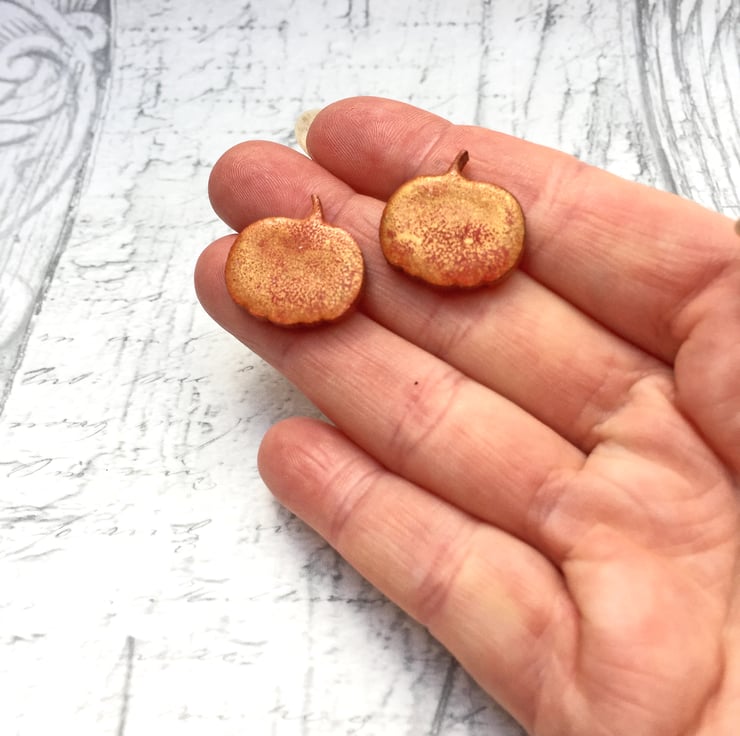 These dainty pumpkin earrings and measure 1.5cm wide by 1.5cm high including the little stalk! On the reverse, I have added surgical steel earring posts and matching scroll backs - perfect for those with sensitive skin as they are hypoallergenic.