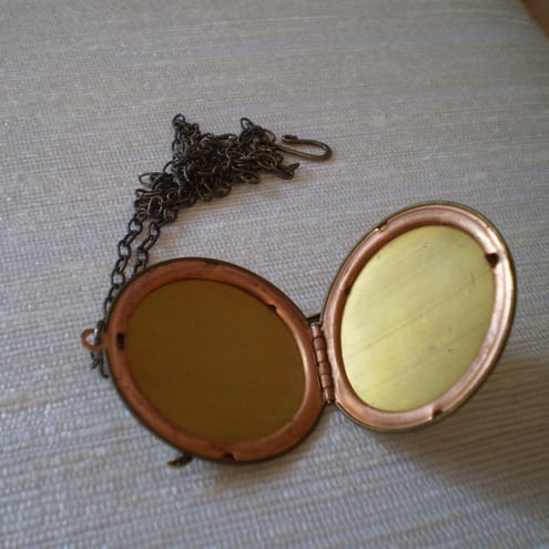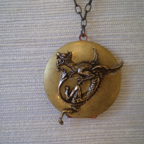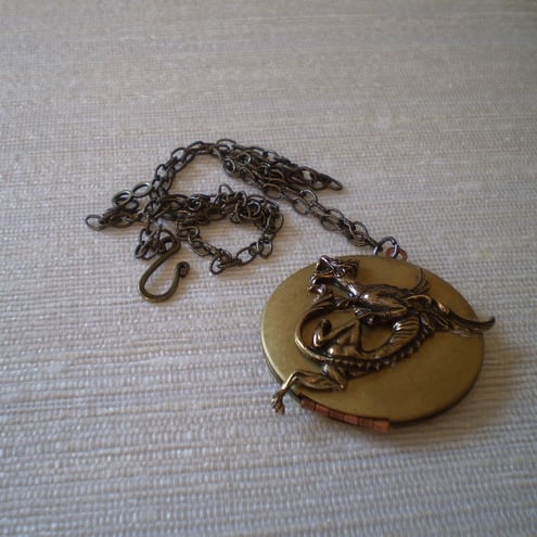 A vintage brass locket has become home for a mythical Dragon, The locket has an antiqued brass finish and the dragon is a detailed stamping. The locket open down from the top... to hold secret of special keepsakes. Hangs from an 18 incj chain with a shepherds hook closure.