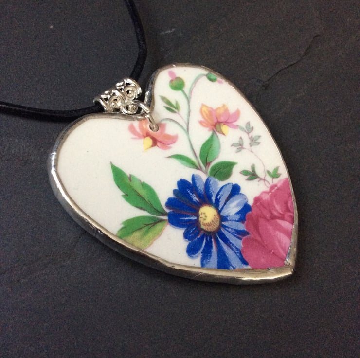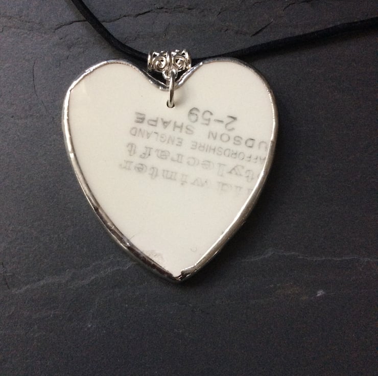 A piece of Staffordshire pottery has been shaped into a heart and edged with lead free solder to form this pendant.