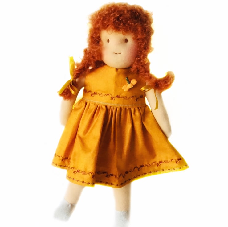 Marigold lives with her dad in the hardware shop in Mulberry Green and loves growing things. She is wearing a lovely dress made from best quality cotton in golden yellow. The dress is embroidered at the waist and hem and is decorated with a cute little dragonfly on the lined bodice and another on the fastening at the back of the skirt. Her ginger hair is in two plaits tied with golden ribbons.