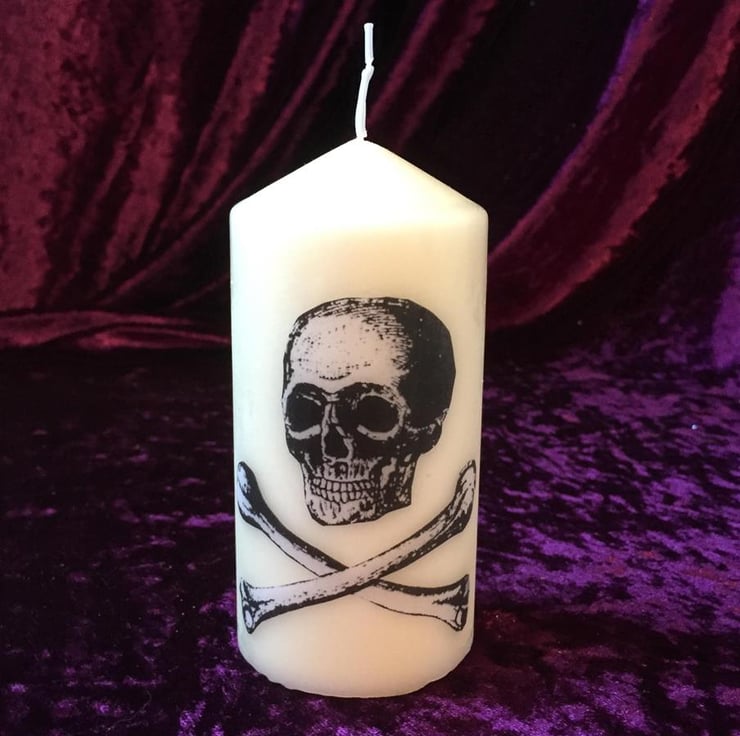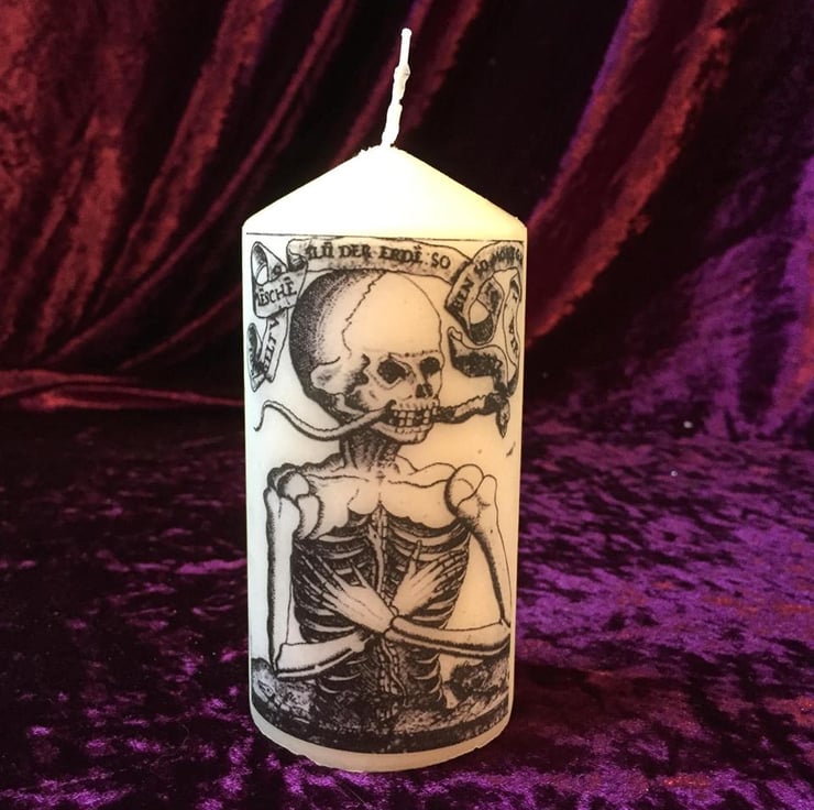 The images on these candles are taken from Mediaeval art and depictions of death and the Grim Reaper from the 5th to the 15th century.