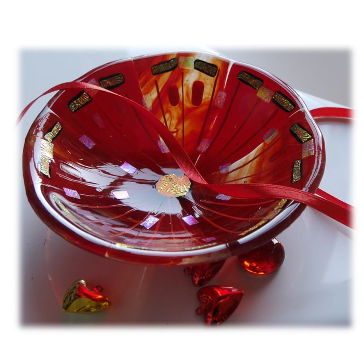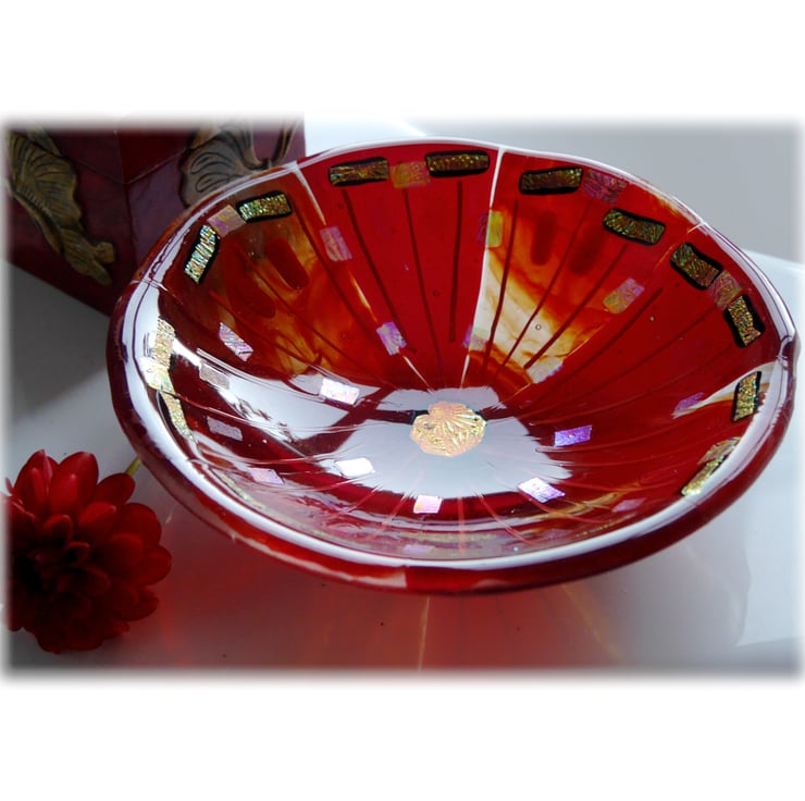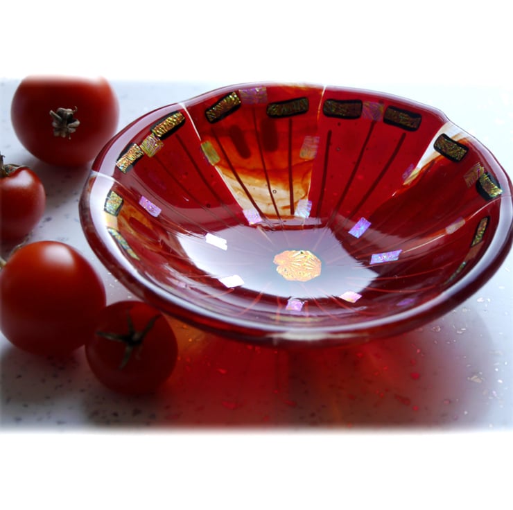 This is fused glass bowl, twice fired to very high temperatures in my kiln, first to fuse all the glass together as a flat circle, 2nd to slump it over a little mold into a dish.