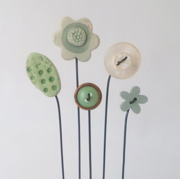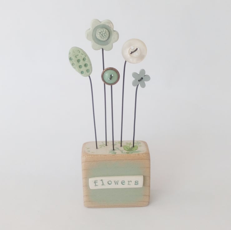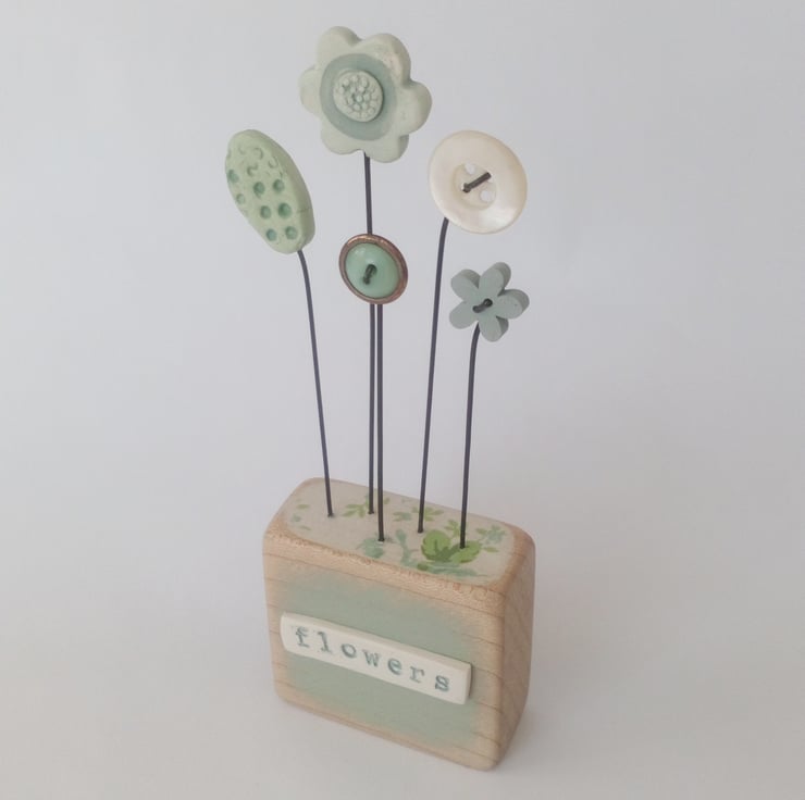 Button and clay flowers grow in this flower garden, standing on their wire stalks in a decoupaged oak wood block.