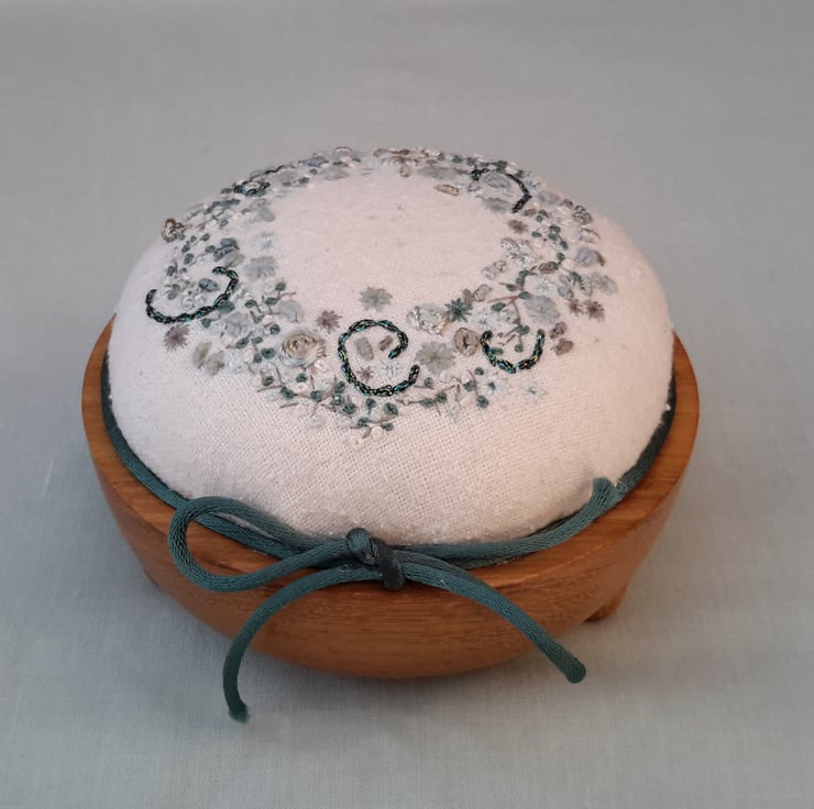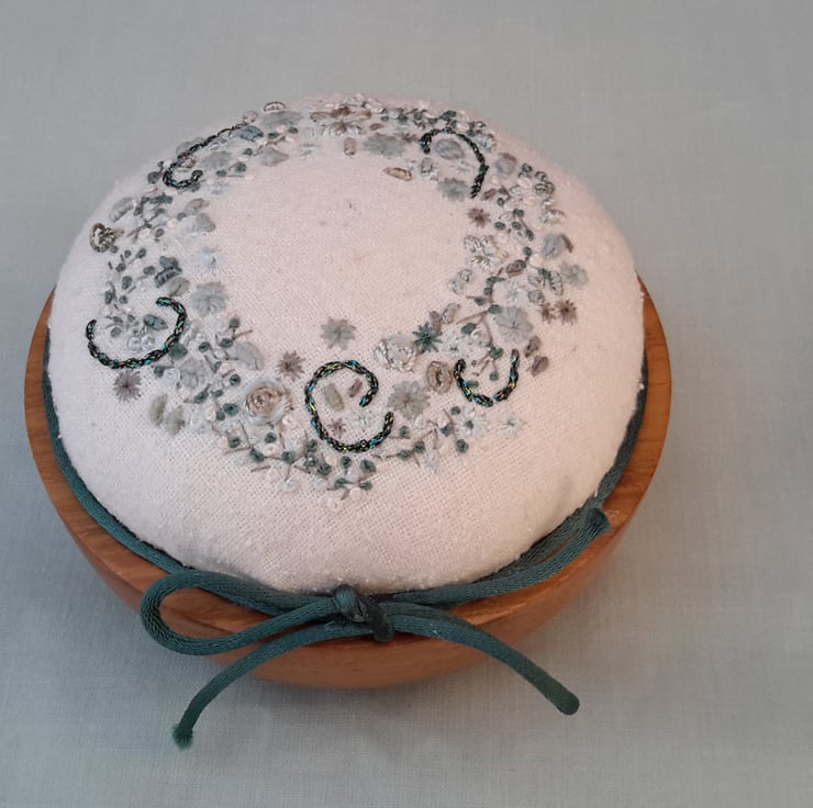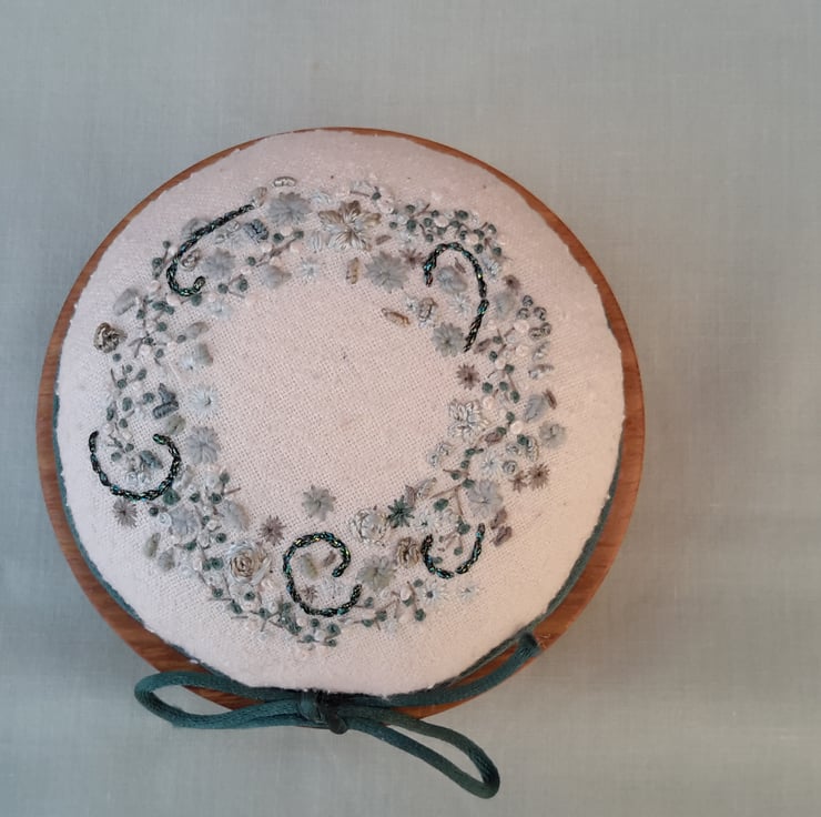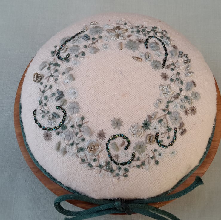 Beautiful hand embroidery in bluey greens using various threads and stitches, finished with a green satin bow, sewn onto natural silk noil which is backed with cotton fabric.