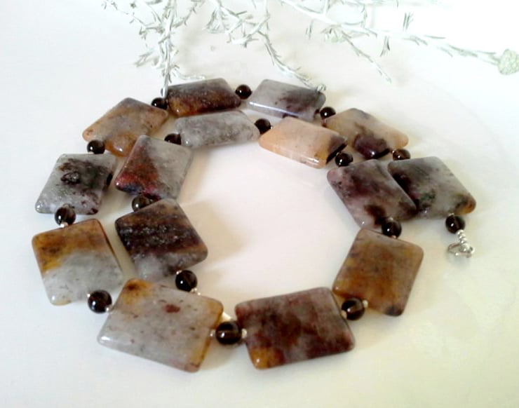 The item has large pillow cut agate rectangles with quality deep clear brown small round smokey quartz gemstones. Between each one are genuine 925 sterling silver spacer beads. For the main construction professional double stranded stainless steel jewellers wire has been used for added strength and lasting durability, finished off with a 925 sterling silver bolt ring heavy duty clasp.