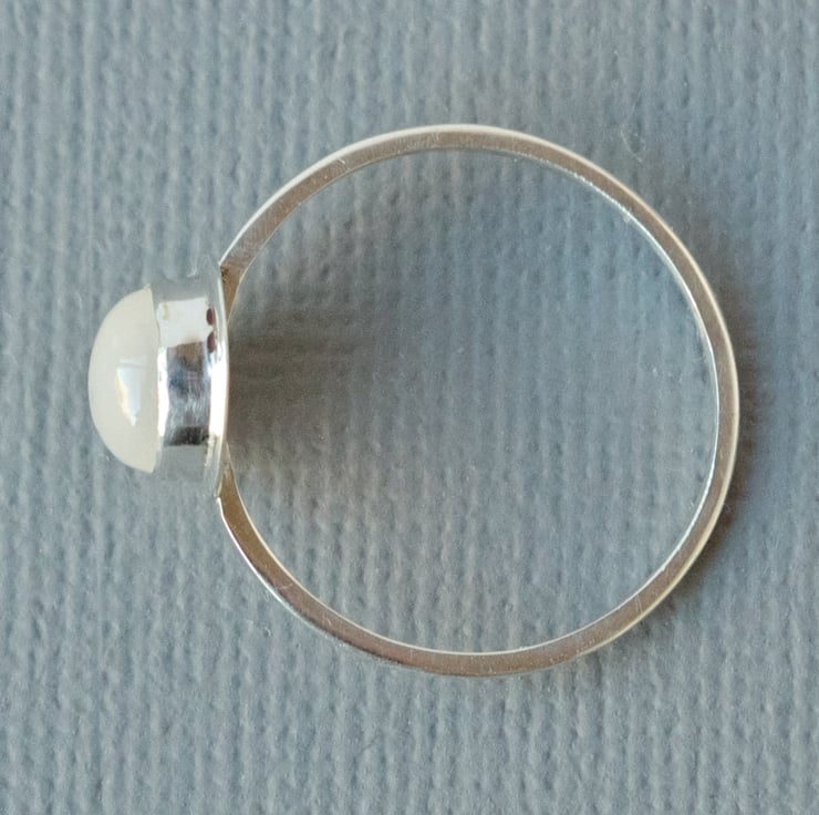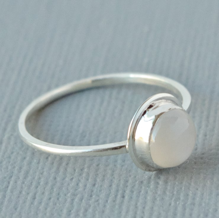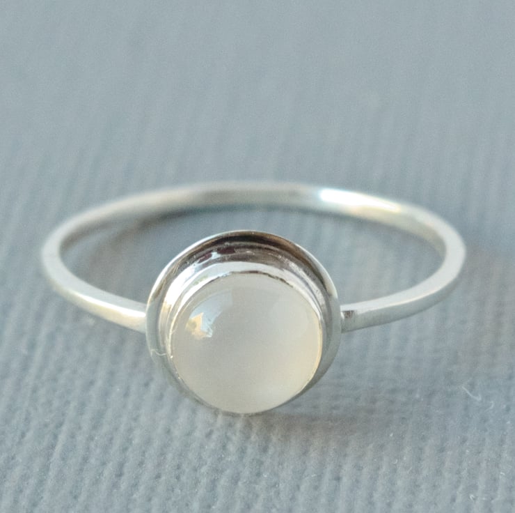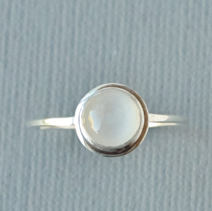 This is a minimalist style solitaire ring in sterling silver featuring a stunning white 6 mm moonstone with a delightful smooth schiller (sheen like a cat's eye) across the stone and no visible inclusions. Inclusions are flecks of other materials in the gemstone that can sometimes be found in less expensive stones. This ring shown is a UK size K, but I can make the ring from scratch to your own size. Please let me know your UK ring size before purchasing this item, via the drop down Options menu, so that it can be sized as necessary. The ring has an 8 mm bezel surround in a primitive medieval style setting and a slim 1 mm wide D shaped band for comfort when wearing. The bezel sits flat to the finger allowing the stone to sit straight whilst in wear, but this does mean it is not a stacking ring. I will stamp the ring 925 to signify sterling silver.