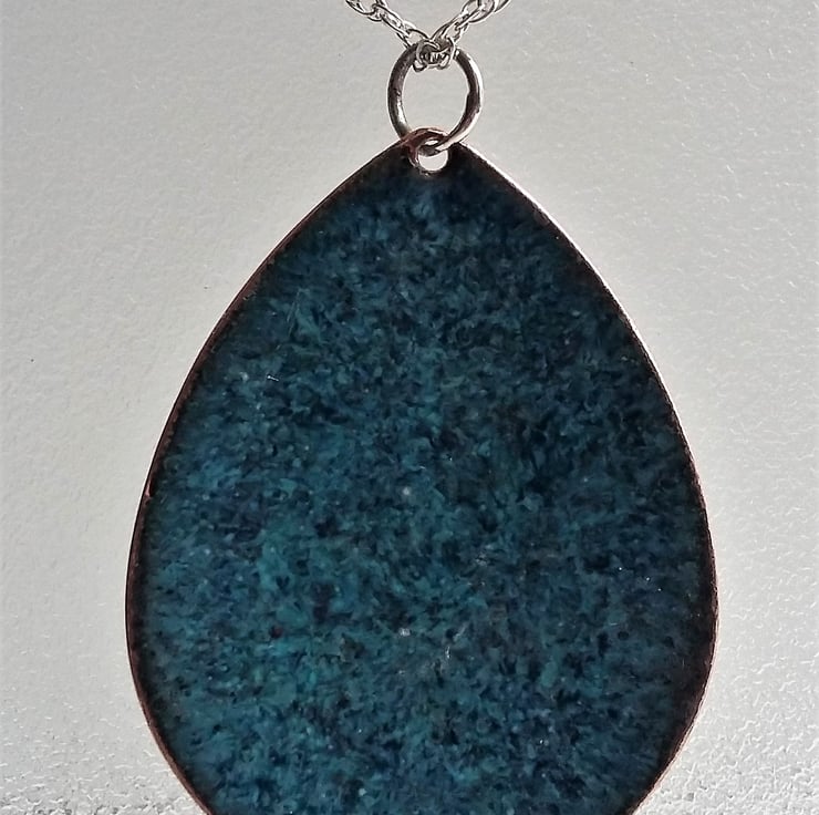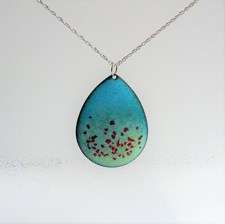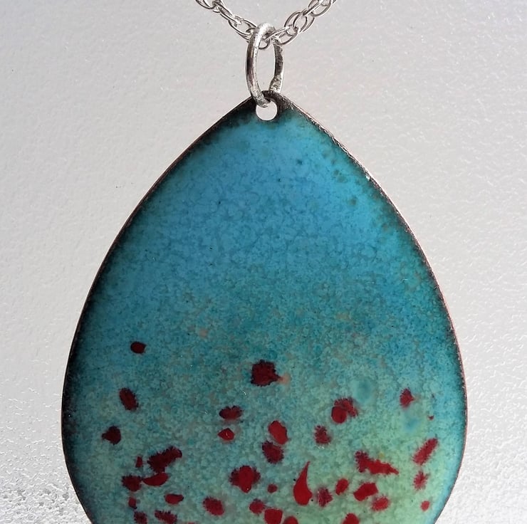 Teardrop enamelled copper pendant in soft shades of green and blue overlaid with ‘poppies’ in red enamel. The pendant has been kiln-fired and measures approximately 40mm long and 30mm wide at the widest point. The back has been enamelled to give a dark blue tweed effect. It comes complete with an 18” sterling silver rope chain with a soldered sterling silver jump ring and is supplied with a little organza pouch. POSTAGE IS FREE!