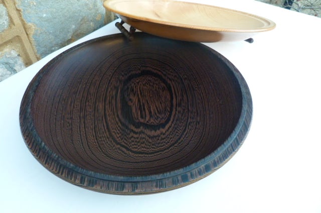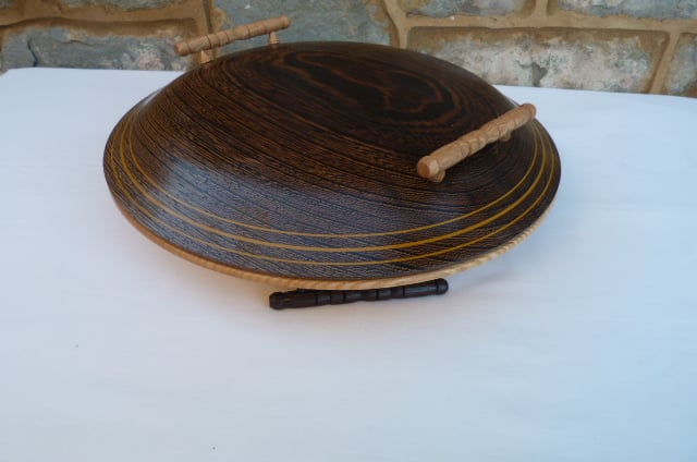 SALAD BOWL WITH A LID, KEEPS THE SALAD FRESH TO SERVE, CAN BE TURNED OVER TO CONTRAST THE COLOURS OF THE FOOD AGAINST THE BOWL, THEN THE HANDLES BECOME THE FEET. 14-1/2'' WIDE, TURNED FROM ASH AND WENGE. FINISHED AND TREATED WITH FOOD SAFE