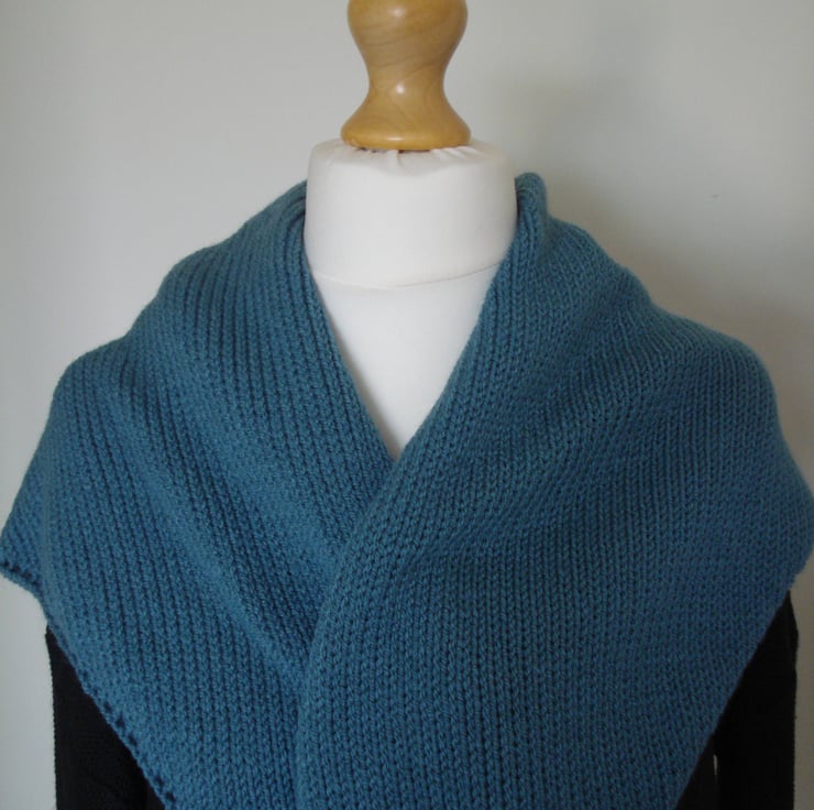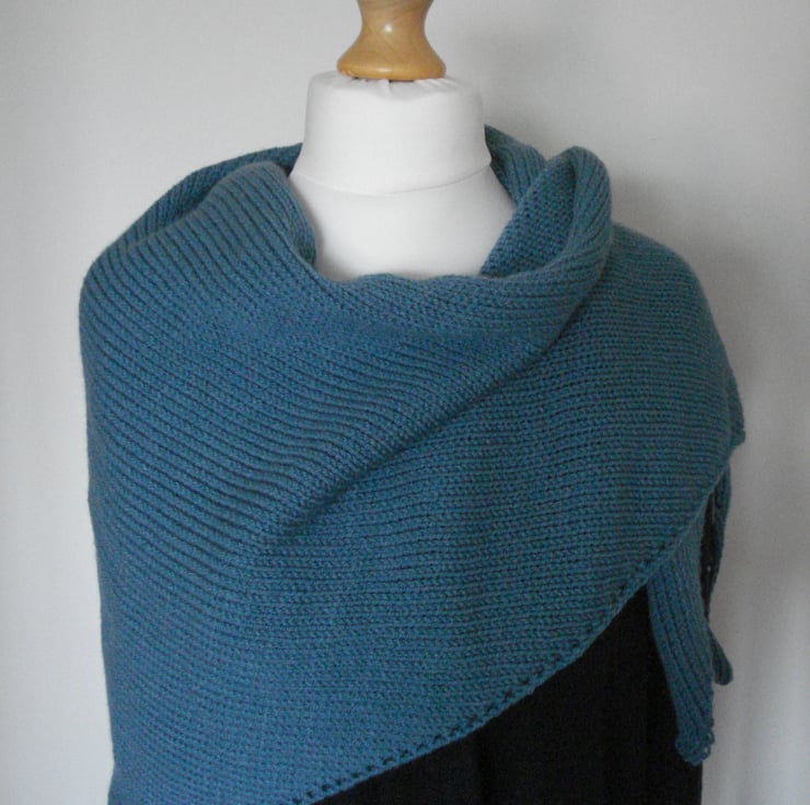 This triangular knitted wrap is lovely and soft and will make a much loved addition to your wardrobe, or a wonderful gift. It has been lovingly knitted on a domestic, hand operated knitting machine, and features pretty eyelets along two sides.