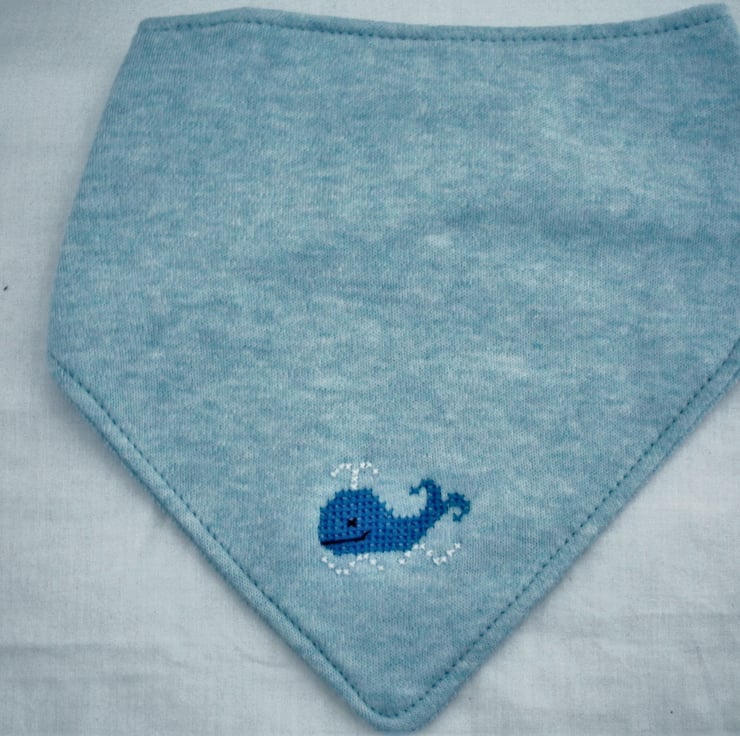 This is a pale blue marl dribble bib by F&F upon which I have hand-embroidered a smiley blue whale. The bib has an adjustable press-stud fastening and is machine washable at up to 40C. The front is cotton, the back cotton polyester towelling.