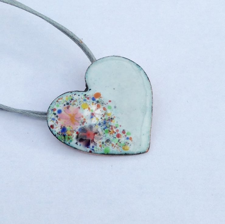 This beautiful little heart measures approx. 25mm x 25mm. Made from copper, I have kiln-fired enamels onto the copper up to 4 times per necklace, including the flowers. Have soldered a copper attachment to the back of the heart to take thread or chain and have added 18 ins. waxed cotton plus copper clasp. Sits beautifully around the neck.