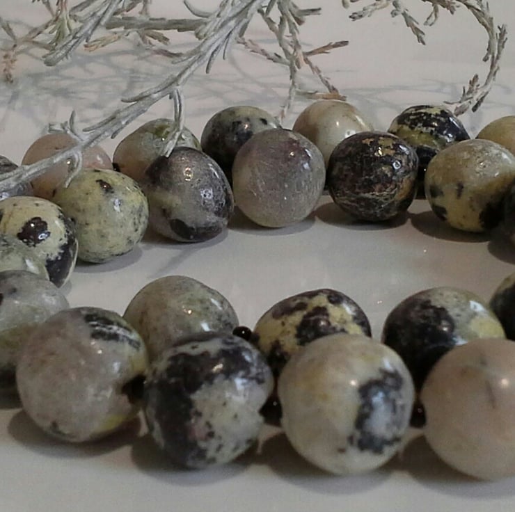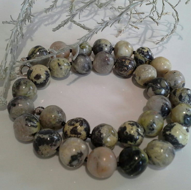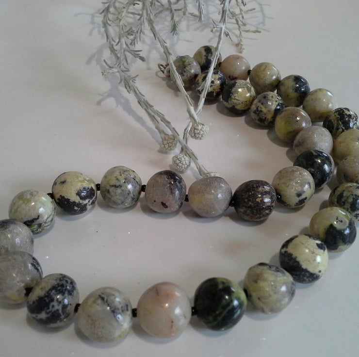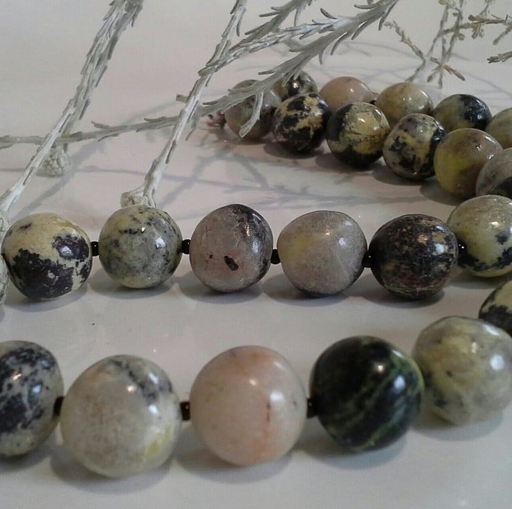 An organic looking necklace designed and hand crafted using irregular shaped round serpentine rounds with micro black agate gemstones beads between each one. This would make a lovely inexpensive genuine gemstone gift for ladies of all ages.