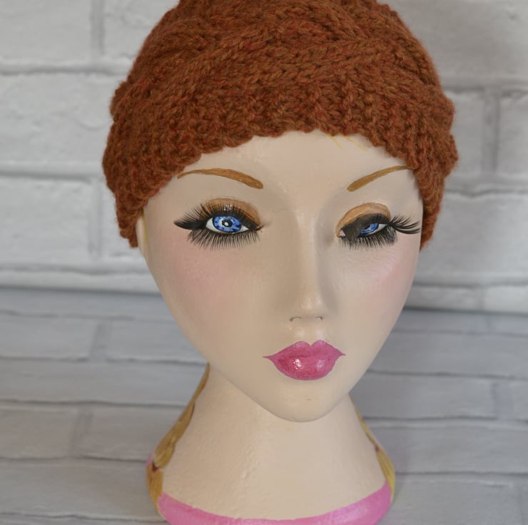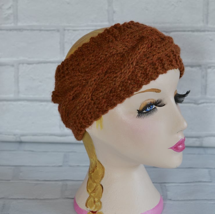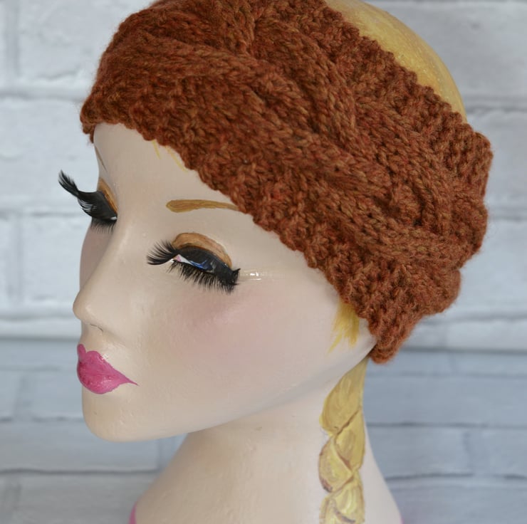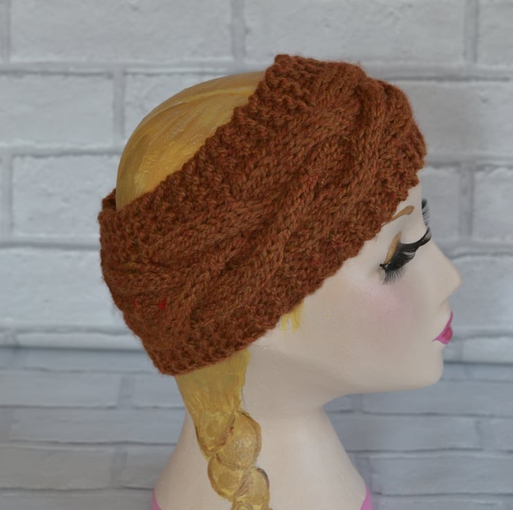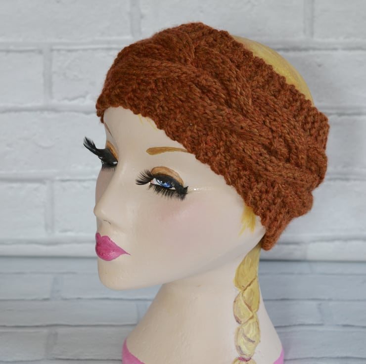Cable chunky knitted wide headband earwarmer. Knitted in a lovely yarn called chesnut with subtle rust undertones to it with 25% wool fibres. It will fit heads 22" - 23"