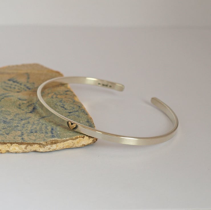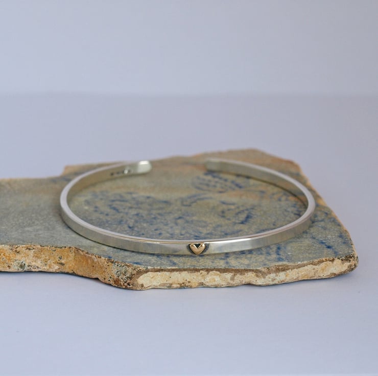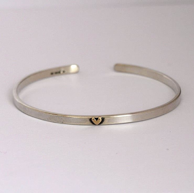A hand sawn, filed to shape a 9ct yellow recycled gold heart is soldered onto the centre of a strip of recycled sterling silver. The sterling silver strip's ends are filed to a curve. The strip is then formed with a mallet around a bangle mandrel to a lovely round cuff shape.