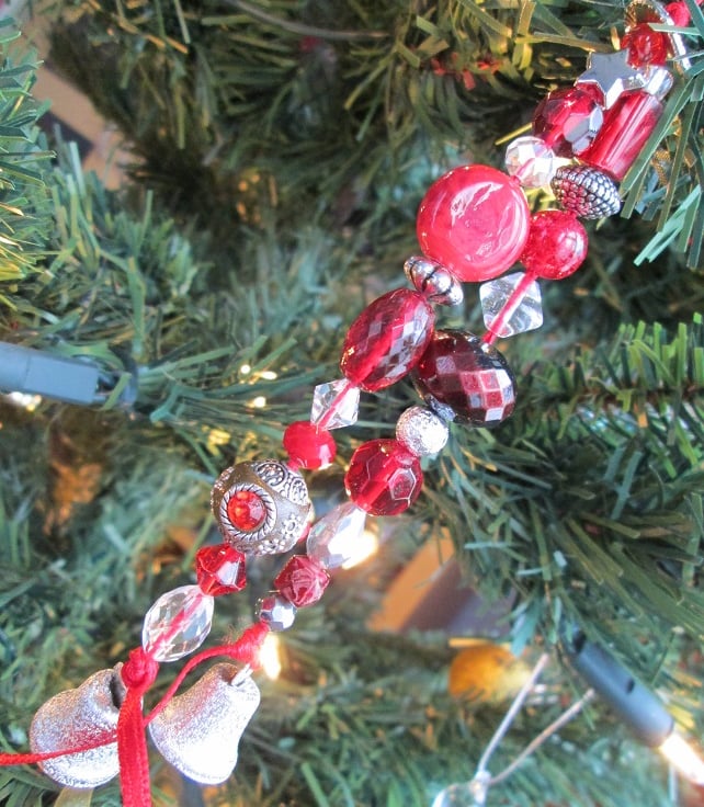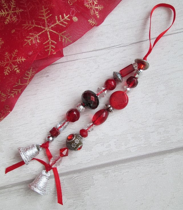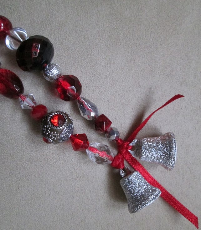 An opulent, completely unique, red and silver tree decoration made up of hand picked beads strung onto red ribbon and finished with a pair of sparkly silver bells. Approximately 15 cm long (not including hanging loop).