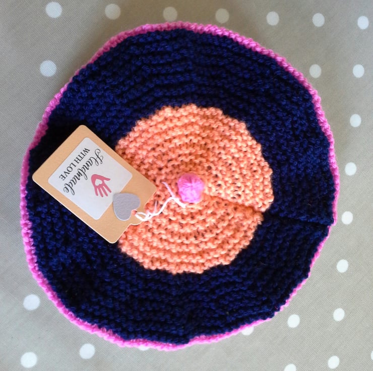 A lovely warm practical baby girl's beret style hat designed and hand crafted using quality branded British manufactured machine washable yarns. The hat has the Demelza branded garment label attached to the inside hat seam for it's proof of origin with the care instructions woven within it for lasting reference.