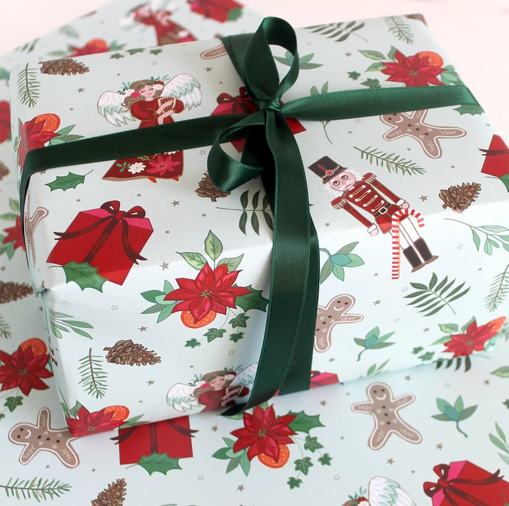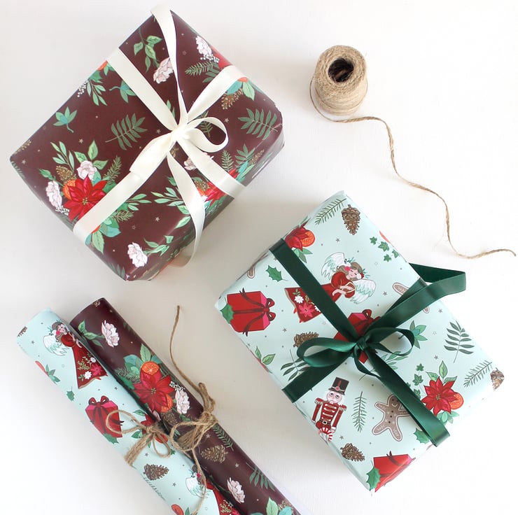 Gift wrap comes as folded flat sheets inside a protective compostable cello sleeve.