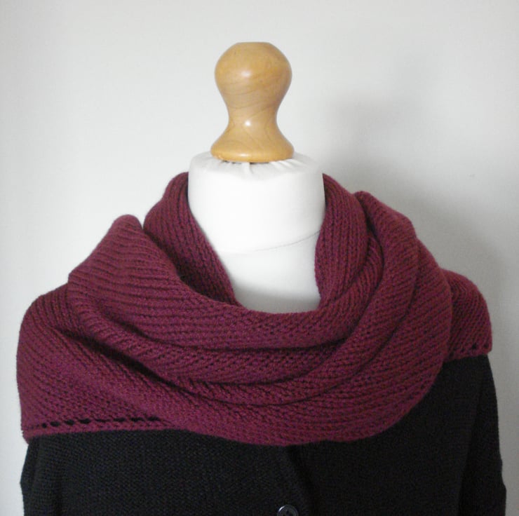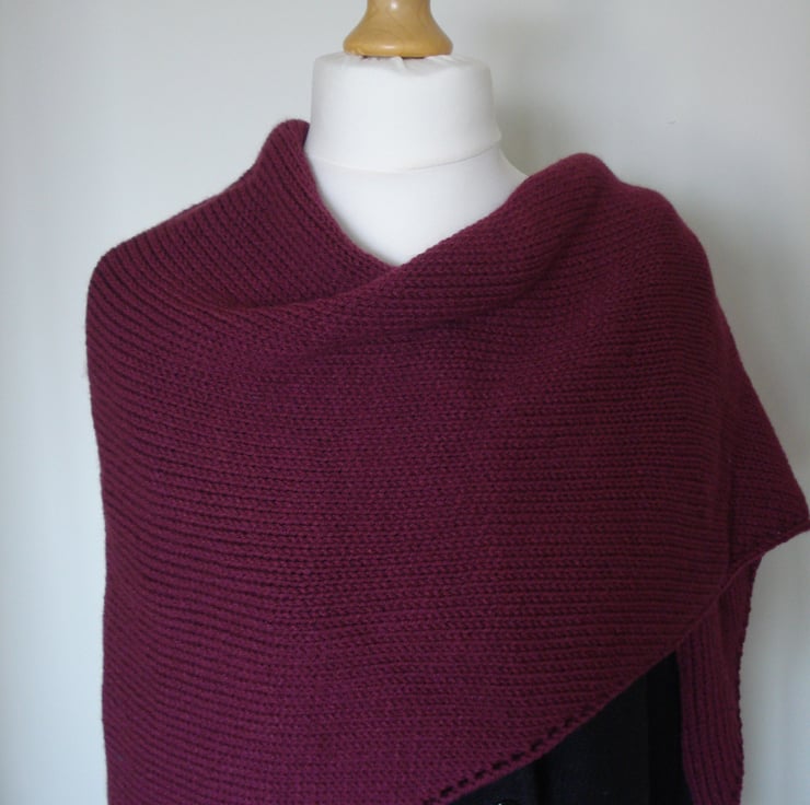 This triangular knitted scarf is beautifully soft and will make a much loved addition to your wardrobe, or a wonderful gift. It has been lovingly handmade on a domestic, hand operated knitting machine, and features pretty eyelets along two sides.