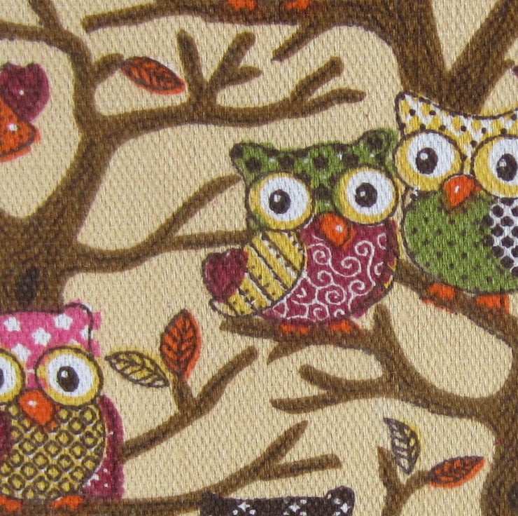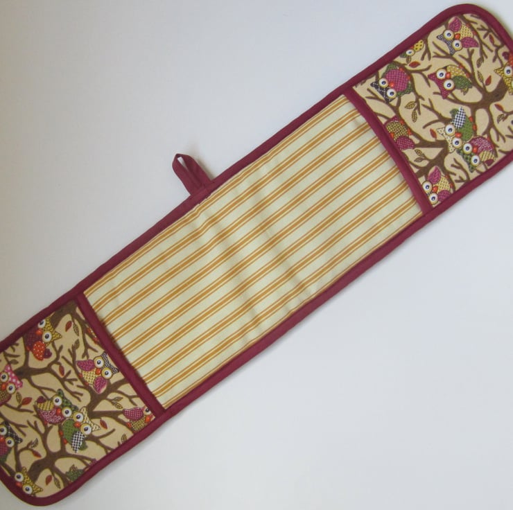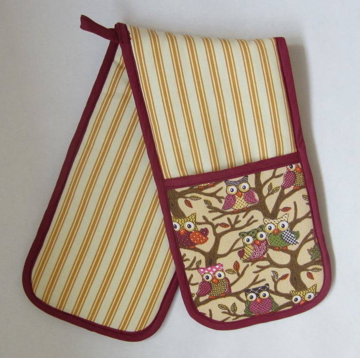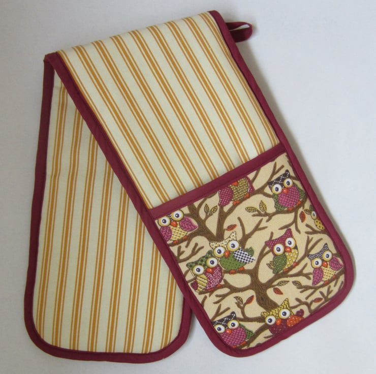 Thickly padded owl and rusty orange and cream stripe oven gloves, edged with maroon bias binding.